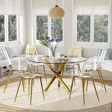 Clear Round Glass Dining Table Set for 6, 7 Pcs Modern Minimalist Circle Dining Room Table Set, 47'' Luxury Circular Kitchen Table Chairs Set, Clear Acrylic Chair for Home (Golden)