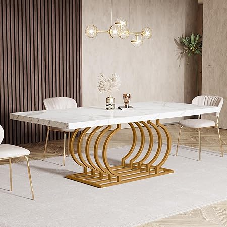 Tribesigns 70.9" Dining Table for 6, Modern White Dining Room Table with Faux Marble Veneer Tabletop, Wood Kitchen Table Dinner Table with Geometric Frame, Kitchen, Dining Room, White Gold