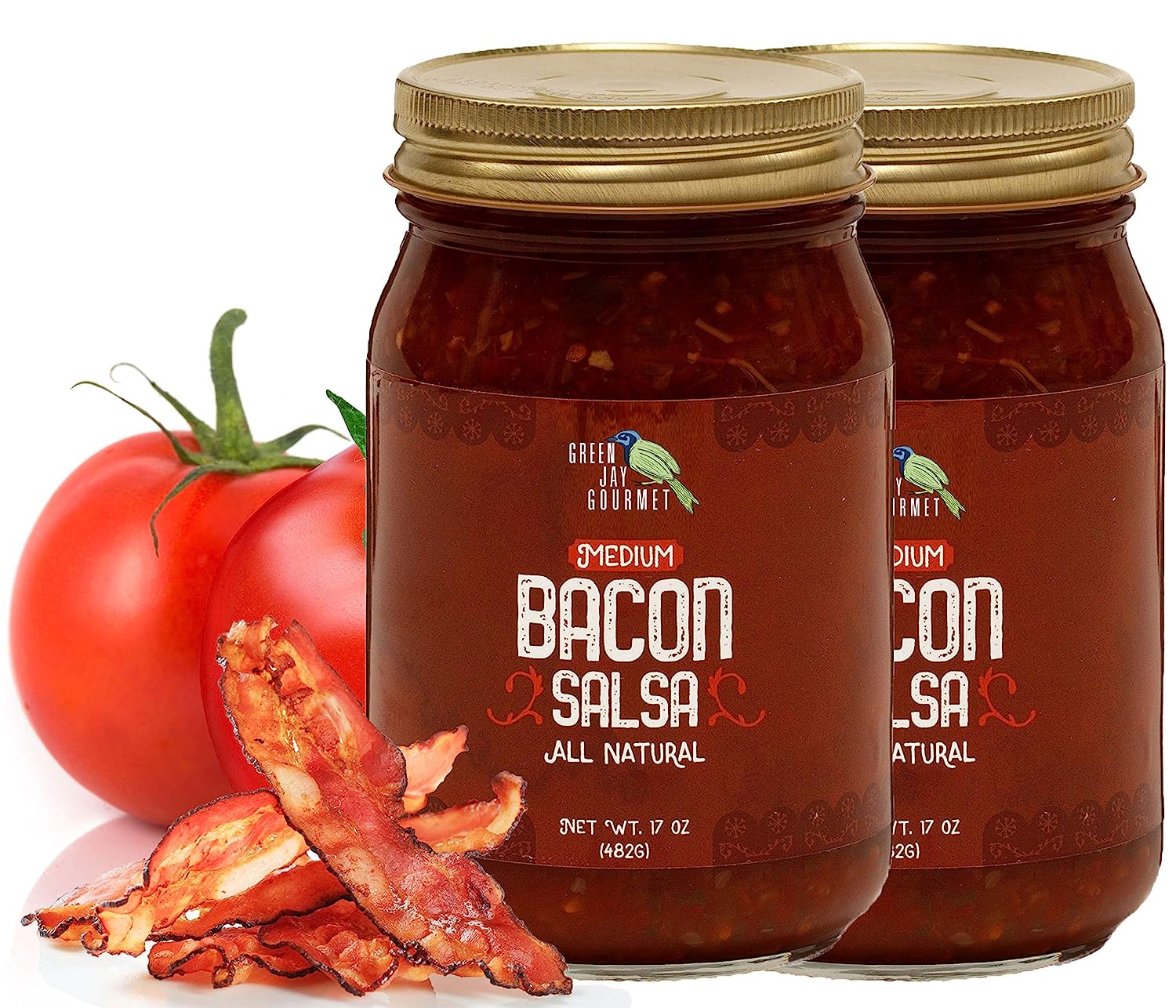 Green Jay Gourmet Bacon Salsa - Medium Heat Salsa with Natural Bacon & Jalapeno Peppers - Gourmet Salsa Dip with No Preservatives - Gluten-Free, MSG-Free, Small Batch Natural Salsa Sauce - 17 Ounces