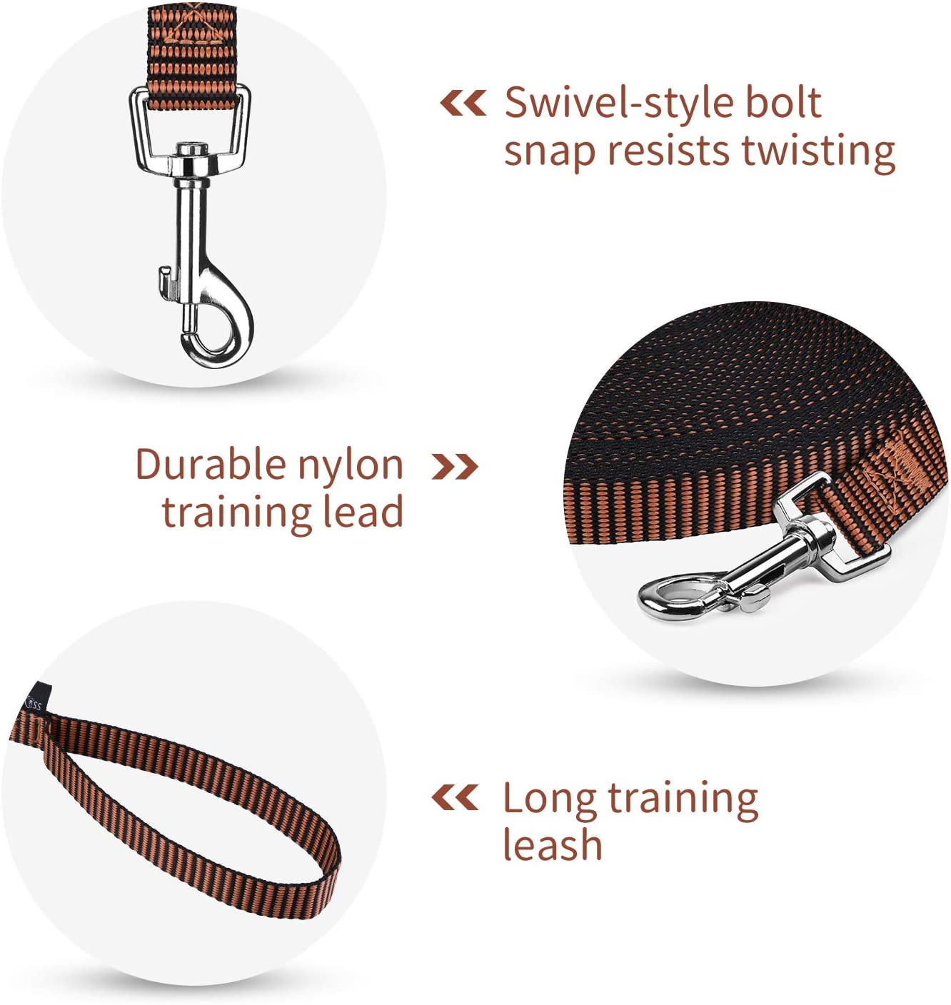• NYLON TRAINING LEAD - This durable, long, nylon dog training leash will outlast cotton leashes. All stitching is reinforced and the nickel plated clip swivels to resist twisting. Our long dog leash is great for medium and large dogs. You'll love using it as a backyard dog leash, for off leash dog training, and more.