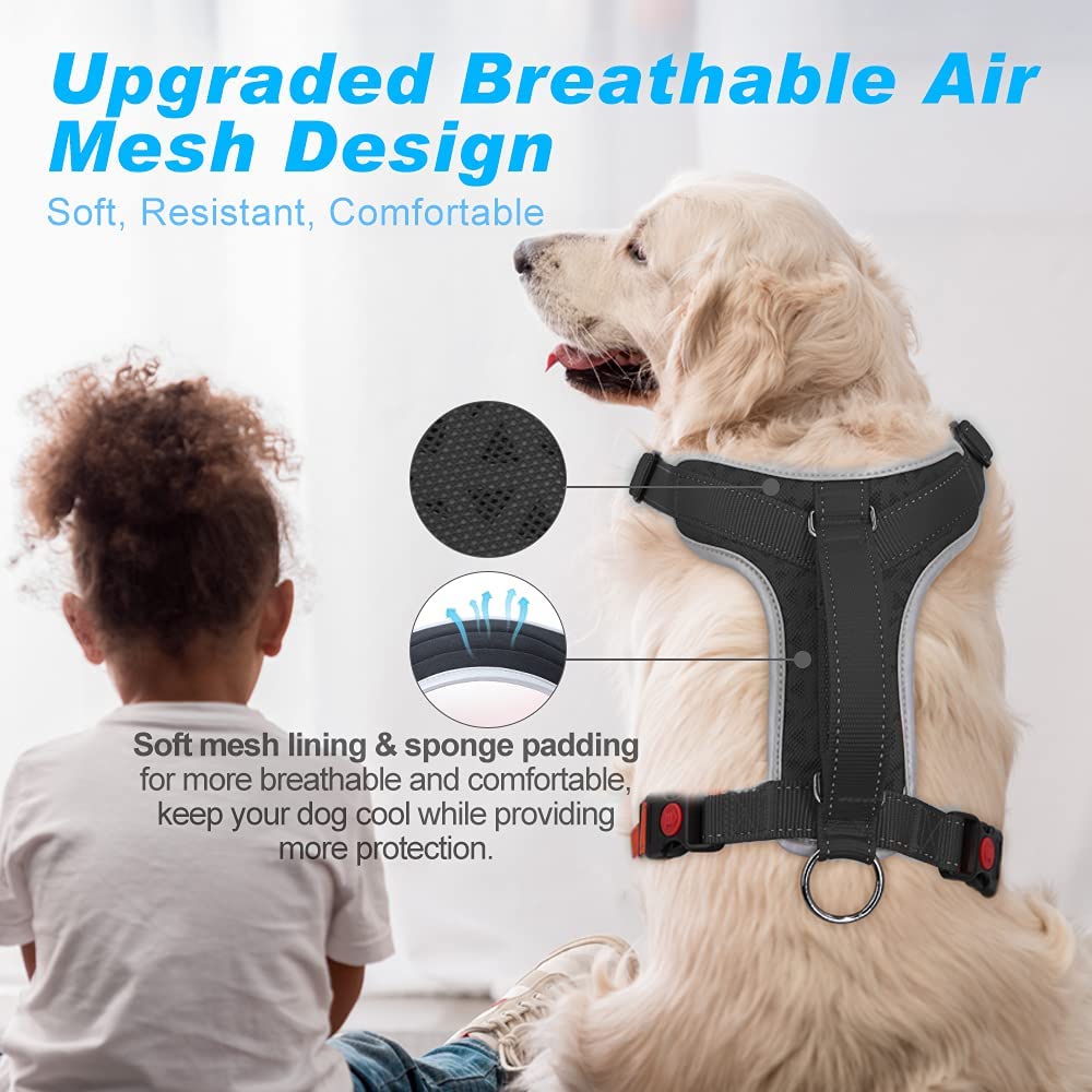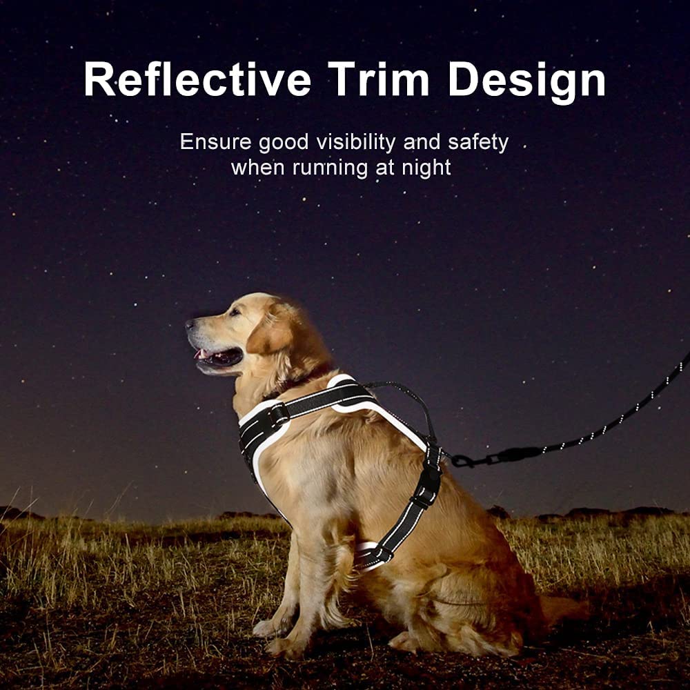 • 【PREMIUM DOG SAFETY HARNESS】--- Our no pull dog harness is made of nylon fabric with exquisite craftsmanship and durable hardware, also lightweight and easy to clean. Breathable mesh lining and soft sponge padding design for extra protection and comfort, keep your dog cool while minimizing the chance of hurting in case of pulling. 3M reflective straps to ensure good visibility and safety when night running. Your puppy deserves this best dog harness with leash.