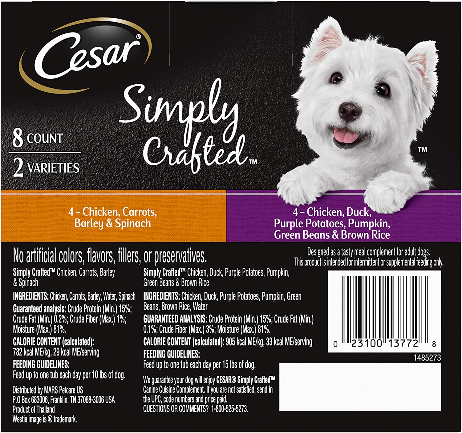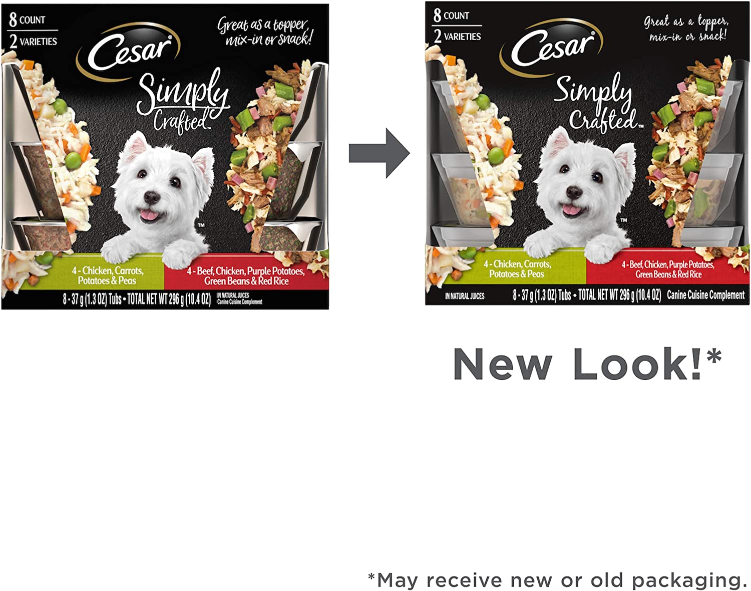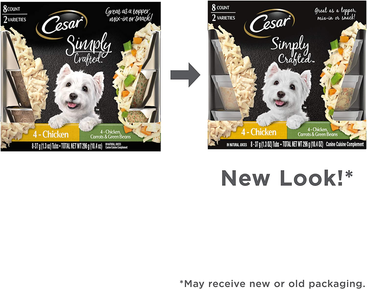 Dogs love the great taste of CESAR Wet Dog Food. CESAR SIMPLY CRAFTED Complements Tubs were designed to give dogs a simple and tasty meal complement. Add our real chicken and wholesome, quality-ingredient moist dog food recipes to any complete and balanced meal as a healthy topper. SIMPLY CRAFTED is designed with no artificial colors, flavors, fillers, or preservatives, and is always served in convenient tubs with no-fuss, easy peel freshness seals, making meal-time easy. The CESAR Brand is always looking to unlock more shared moments of joy between you and your furry friend.
