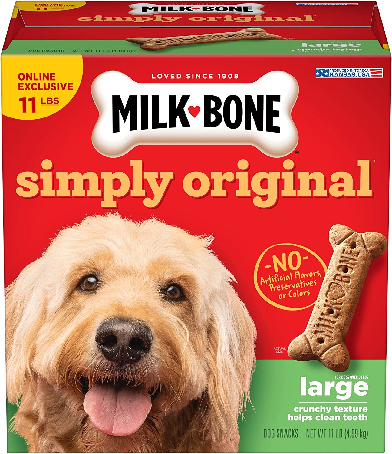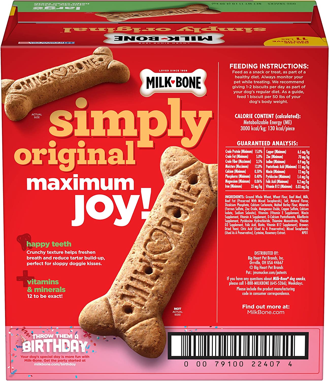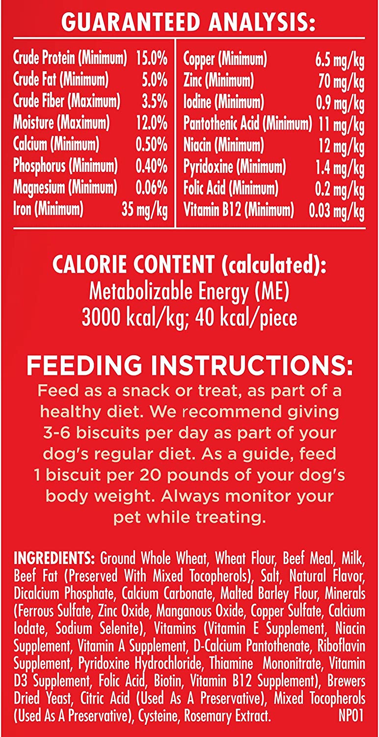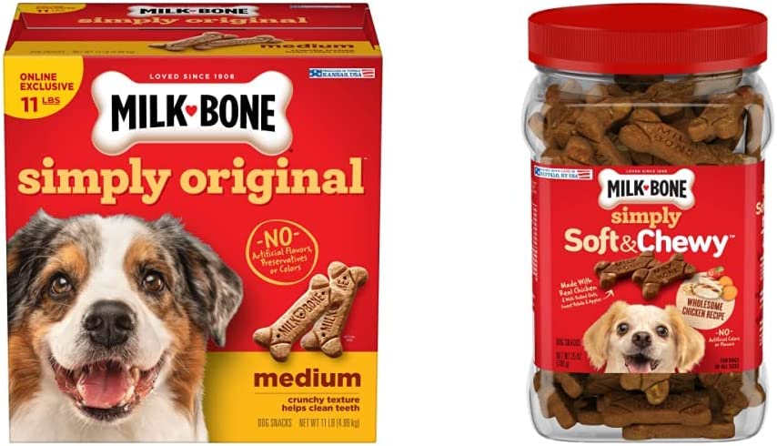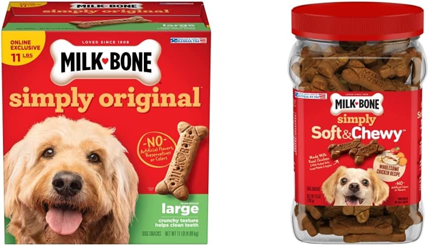 Milk-Bone Simply Original Large Dog Biscuits are dog treats you can feel good about giving. On top of being irresistibly tasty, these wholesome biscuits are made with vitamins and minerals—12 to be exact! The texture of these crunchy dog treats also helps clean teeth and freshen breath for happier doggy kisses. But the best part? We simplified our beloved biscuit recipe to include no artificial flavors, preservatives or colors. So, go ahead! Make any day more special for your dog, whether it’s their birthday or a day that ends in “-y”. Pick up a box and bring on the fun.