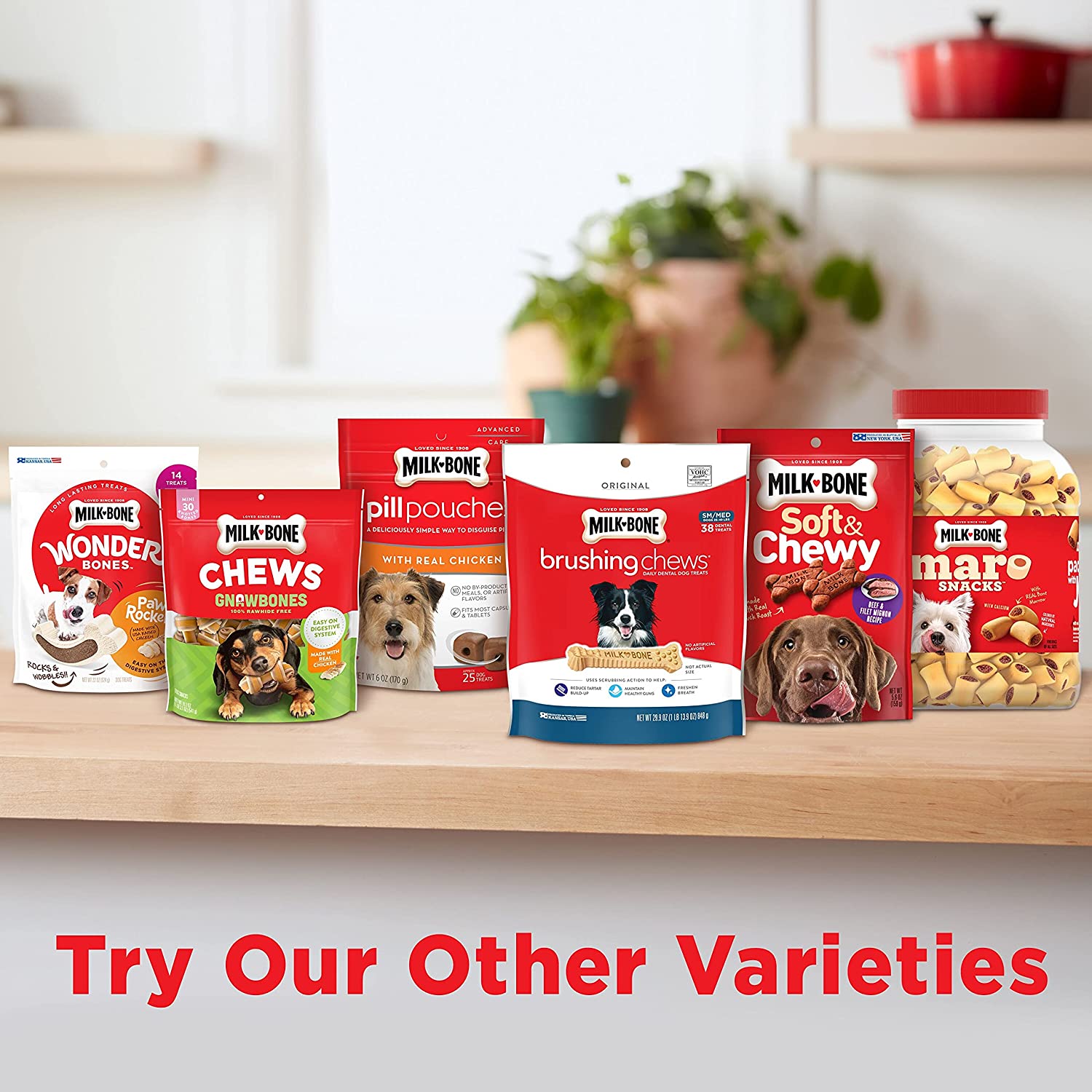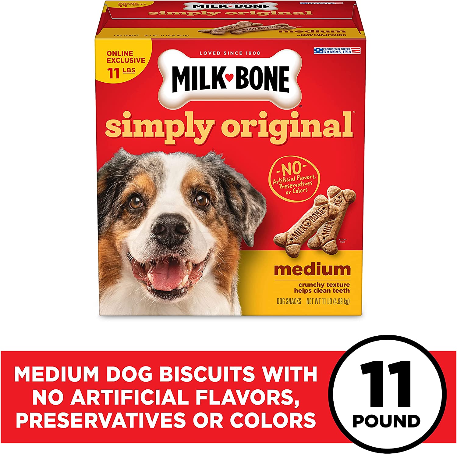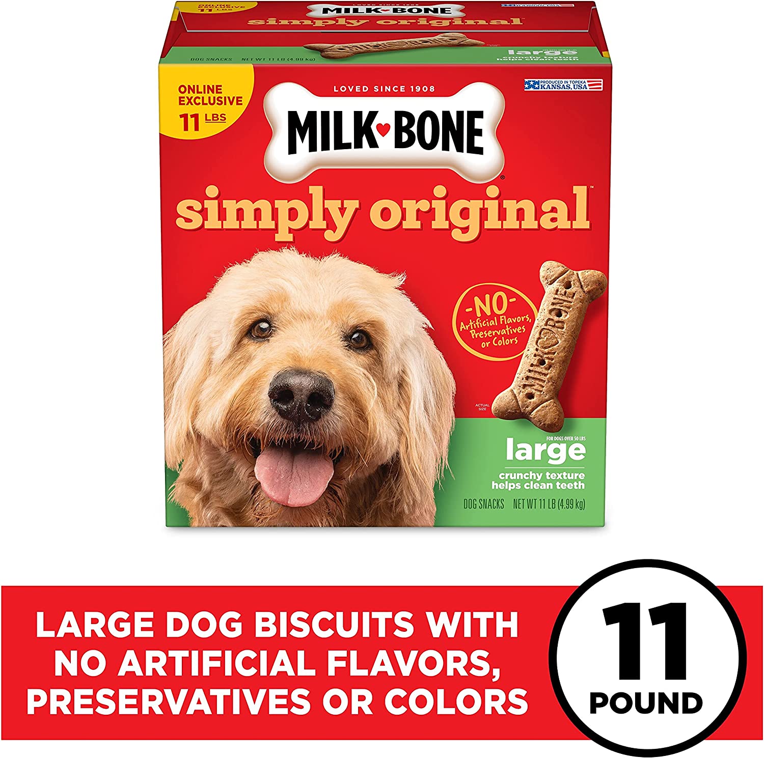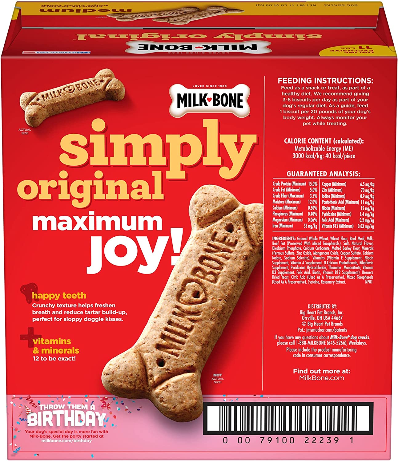 Milk-Bone Simply Original Large Dog Biscuits are dog treats you can feel good about giving. On top of being irresistibly tasty, these wholesome biscuits are made with vitamins and minerals—12 to be exact! The texture of these crunchy dog treats also helps clean teeth and freshen breath for happier doggy kisses. But the best part? We simplified our beloved biscuit recipe to include no artificial flavors, preservatives or colors. So, go ahead! Make any day more special for your dog, whether it’s their birthday or a day that ends in “-y”. Pick up a box and bring on the fun.