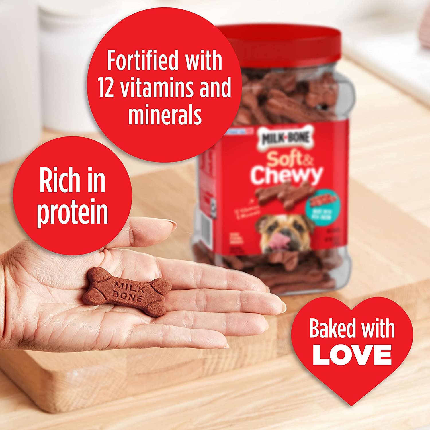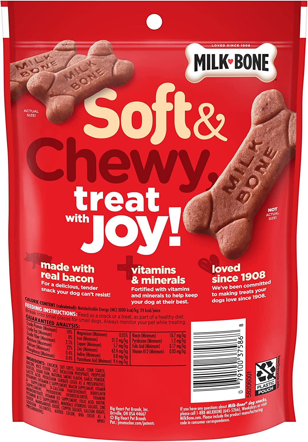 Unleash pure dog joy with mouthwatering taste and texture from a brand you trust: Bust out Milk-Bone Soft & Chewy dog treats made with real bacon. These tender, tempting treats are easy to chew and hard not to love — and not just because they′re full of that savory bacon flavor. They′re also rich in protein, colored by natural ingredients, fortified with 12 vitamins and minerals, and baked with love in Buffalo, New York, USA. In other words, they′re wholesome and tasty dog snacks that you can feel good about giving (and your dog will be thrilled to get). Order now to let your dog in on the fun.