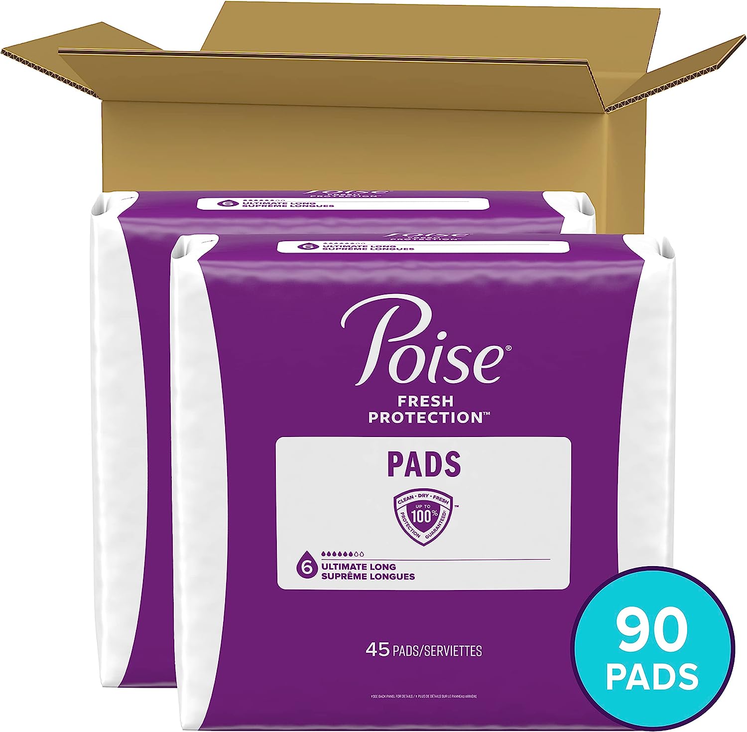 Poise Incontinence Pads & Postpartum Incontinence Pads, 6 Drop Ultimate Absorbency, Long Length, 90 Count, Packaging May Vary