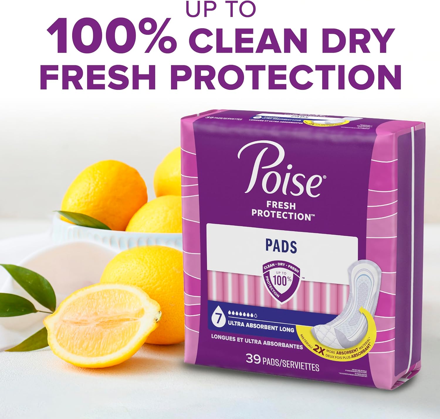 Say goodbye to discomfort from bladder leaks and hello to Poise Postpartum Incontinence Pads in Ultra Absorbency and Long Length, a pad that is designed for your comfort and protection. Poise Ultra Absorbency 7 Drop pads are designed to give you the best protection***. Poise incontinence pads for women are made specifically for bladder leaks, unlike period pads, which are meant for menstrual needs. In fact, Poise pads keep you 10x drier compared to the leading period pad and even feature 2x more absorbent material** to give you the best protection***. Poise pads absorb bladder leaks, lock away wetness, and neutralize odors, helping you feel clean and fresh throughout the day. Our pads are also made with breathable materials that help eliminate dampness, so you feel clean and fresh too! Poise bladder control pads are discreet and fit securely in your underwear. Poise incontinence pads are available in light, moderate, maximum, and overnight absorbencies. For lighter absorbency needs, check out Poise Daily Liners. Shop for Poise discreetly by having it shipped directly to your door or pick up curbside. Poise adult incontinence products are HSA/FSA-eligible in the U.S. *Satisfaction guaranteed or your money back: Online access required. Limit 1 per household. Original receipt/UPC required. Restrictions apply. See Poise website for details. **vs. Poise 4 Drop Pad ***vs. Poise National Brand Daytime pads