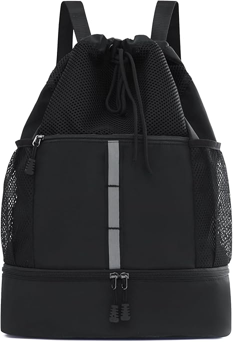 Valleycomfy Drawstring Gym Bag Sports Backpack With Shoe Compartment and Reflective Strips Black
