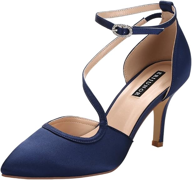 ERIJUNOR Women Comfortable Mid Heel Ankle Strappy Dress Pumps Pointed Toe Satin Wedding Evening Party Shoes
