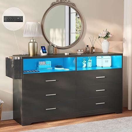 Alohappy 6 Drawer Dresser with Charging Station and LED Lights, Chest of Drawers with Open Storage Cubby, 55" Long Dresser, Modern Wood Dresser for Bedroom, Living Room, Entryway(Black)