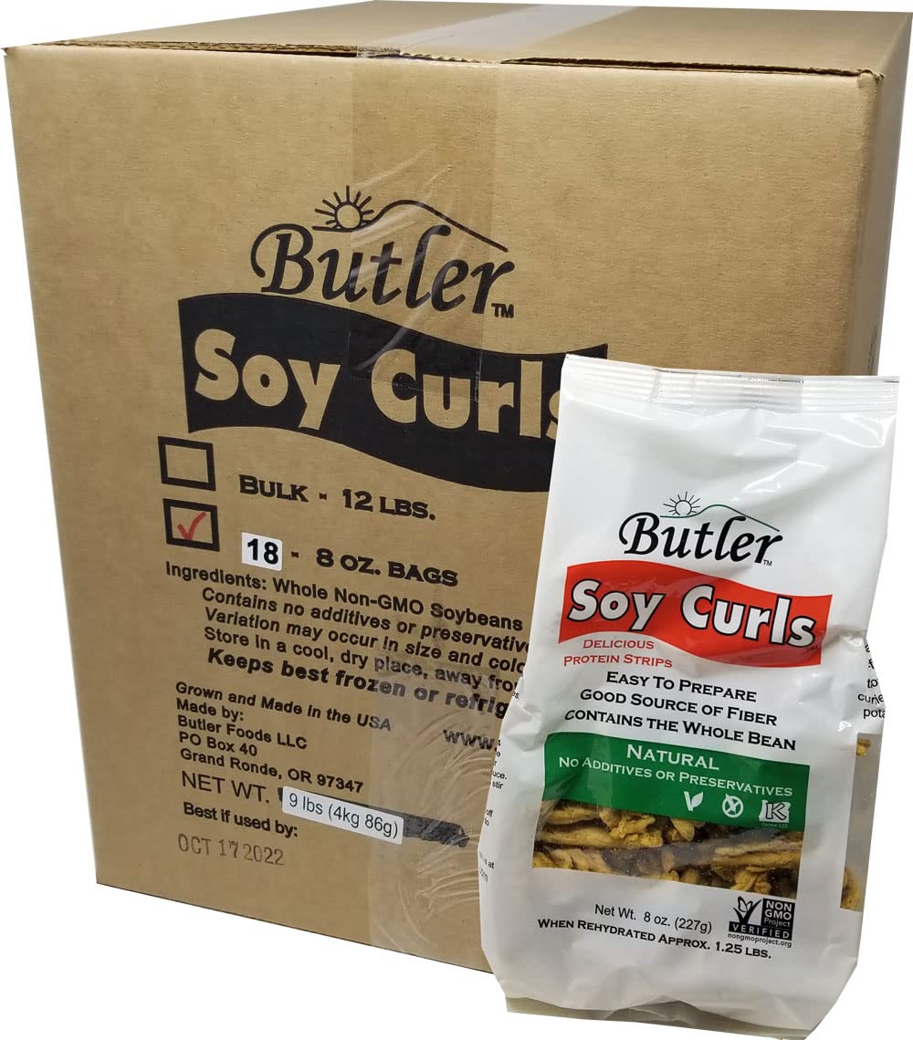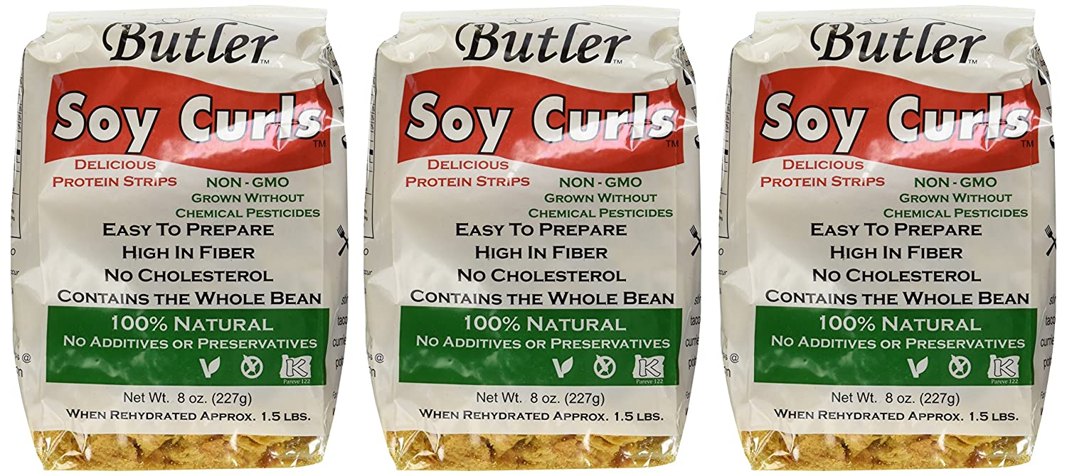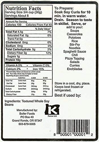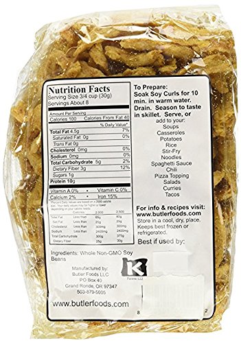 It has been recommended that diets low in saturated fat and cholesterol that include 25 grams of soy protein a day may reduce the risk of heart disease. What luck, because one serving of these new Soy Curls from Butler Foods provides 10 grams of all-natural soy protein! Very versatile and can be incorporated into all kinds of recipes to add natural protein and fiber. Simply soak for about 10 min. in warm water to rehydrate, and they're ready to add to your favorite dish. As they are unflavored, they can take on any flavor you wish them to. Contain all the fiber and protein of select whole soybeans. All natural, no preservatives or additives, and no chemicals used in processing. Soy Curls make a great addition to soups, casseroles, potatoes, rice, stir-fry, noodles, spaghetti sauce, chili, pizza topping, salads, curries, enchiladas, and much more! 8 oz bag (makes 1.5 lbs when rehydrated). Directions: Soak Soy Curls for 10 minutes in warm water. Drain. Season to taste in skillet. Serve.