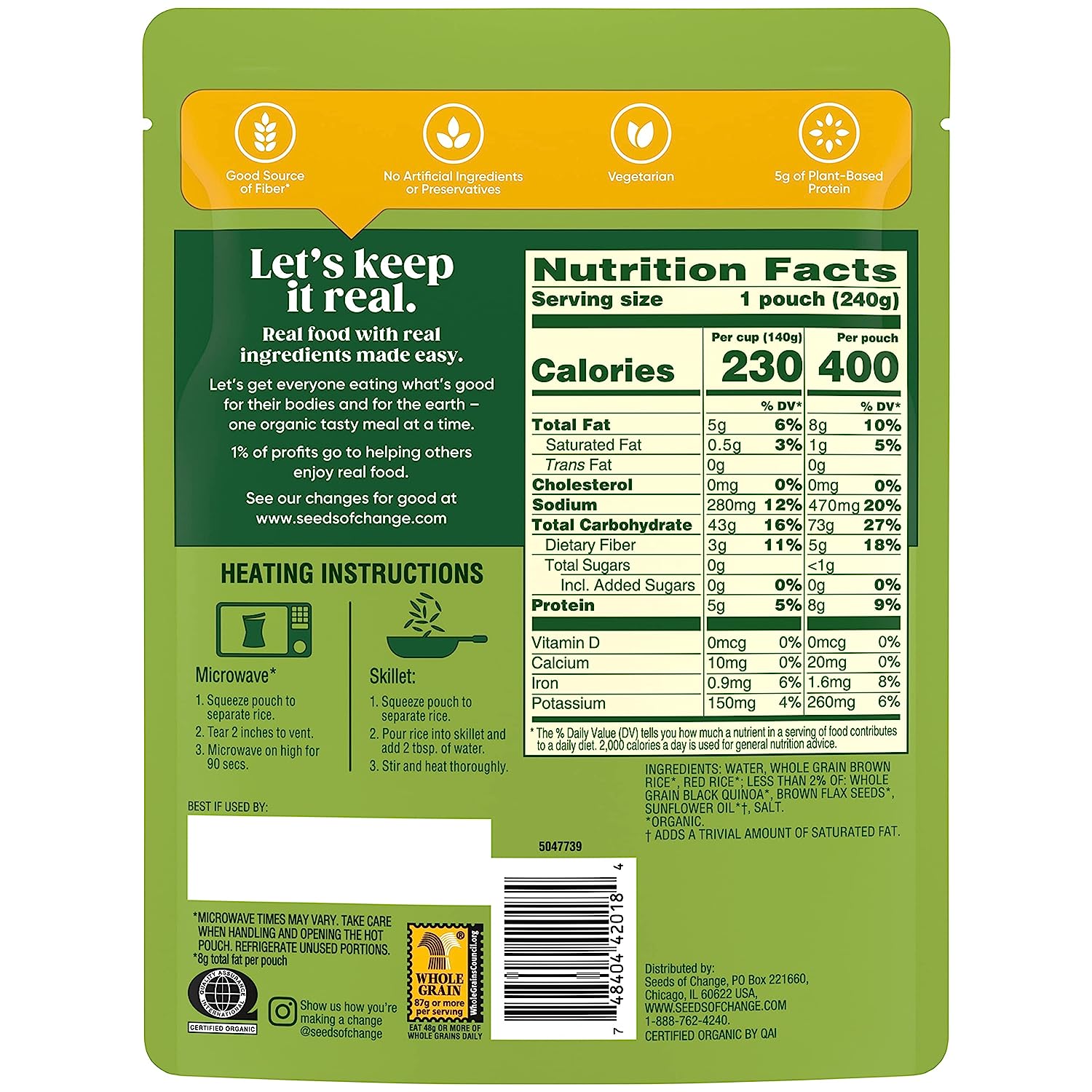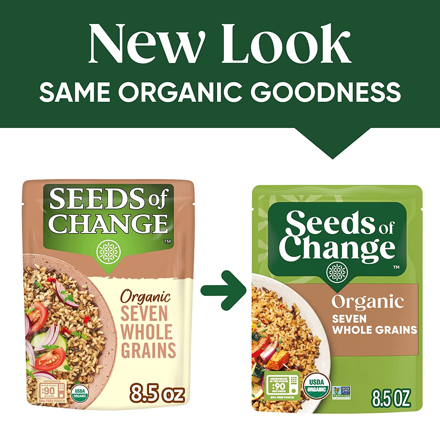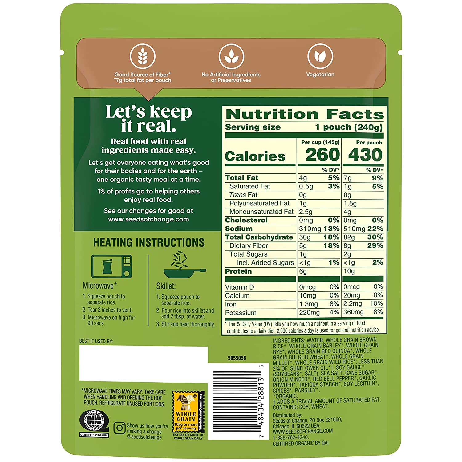 As delicious as it is easy to prepare, SEEDS OF CHANGE Certified Organic Seven Whole Grains Rice lets you explore endless possibilities with a flavorful blend for practically any occasion. The combination of long grain brown rice, bulgur, rye, barley, quinoa, millet and wild rice delivers varied, nutritious and fiber-powered organic food to your favorite rice sides and tasty rice bowls. If you're looking for a quick, vegetarian meal to dig into after a workout, simply place your whole-grain medley in a microwave on High for about 90 seconds; or stir and heat thoroughly in a skillet. Pair your main course with a heavenly seven-grain salad by mixing this SEEDS OF CHANGE whole grain blend with carefully selected parsley, chopped cucumber, green parsley and basil — top it off with crumbled feta cheese for an irresistible dish. Made with USDA-certified organic ingredients and free of artificial colors, preservatives and flavors, SEEDS OF CHANGE rice offers reliably wholesome meals for you and your loved ones. SEEDS OF CHANGE brand believes that real food, carefully prepared with wholesome ingredients, brings exceptional flavor. It is committed to donating a portion of all profits to FoodCorps to help plant nutritious seeds through school growing programs across the country.