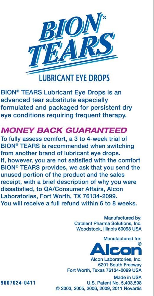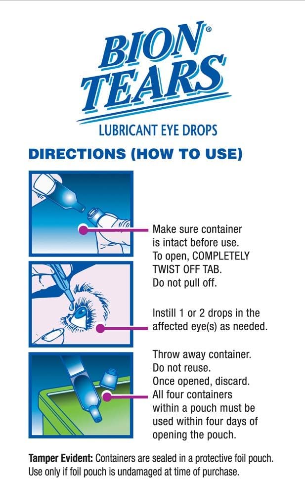 Bion Tears Lubricant Eye Drops is an advanced tear substitute especially formulated and packaged for persistent dry eye conditions requiring frequent therapy. To use, make sure container is intact before use. To open, completely twist off tab. Do not pull off. Instill 1 or 2 drops in the affected eye(s) as needed. Throw away container. Do not reuse. Once opened, discard. All four containers within a pouch must be used within four days of opening the pouch.