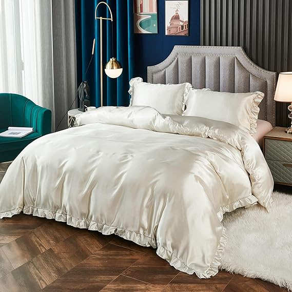 Beige Silky Bedding Luxury Satin Duvet Cover Sets Cream Silk Like Satin Printed Beige Taupe Ruffle Bedding Sets Queen 1 Duvet Cover 2 Pillow Shams (Queen, Beige)_ _