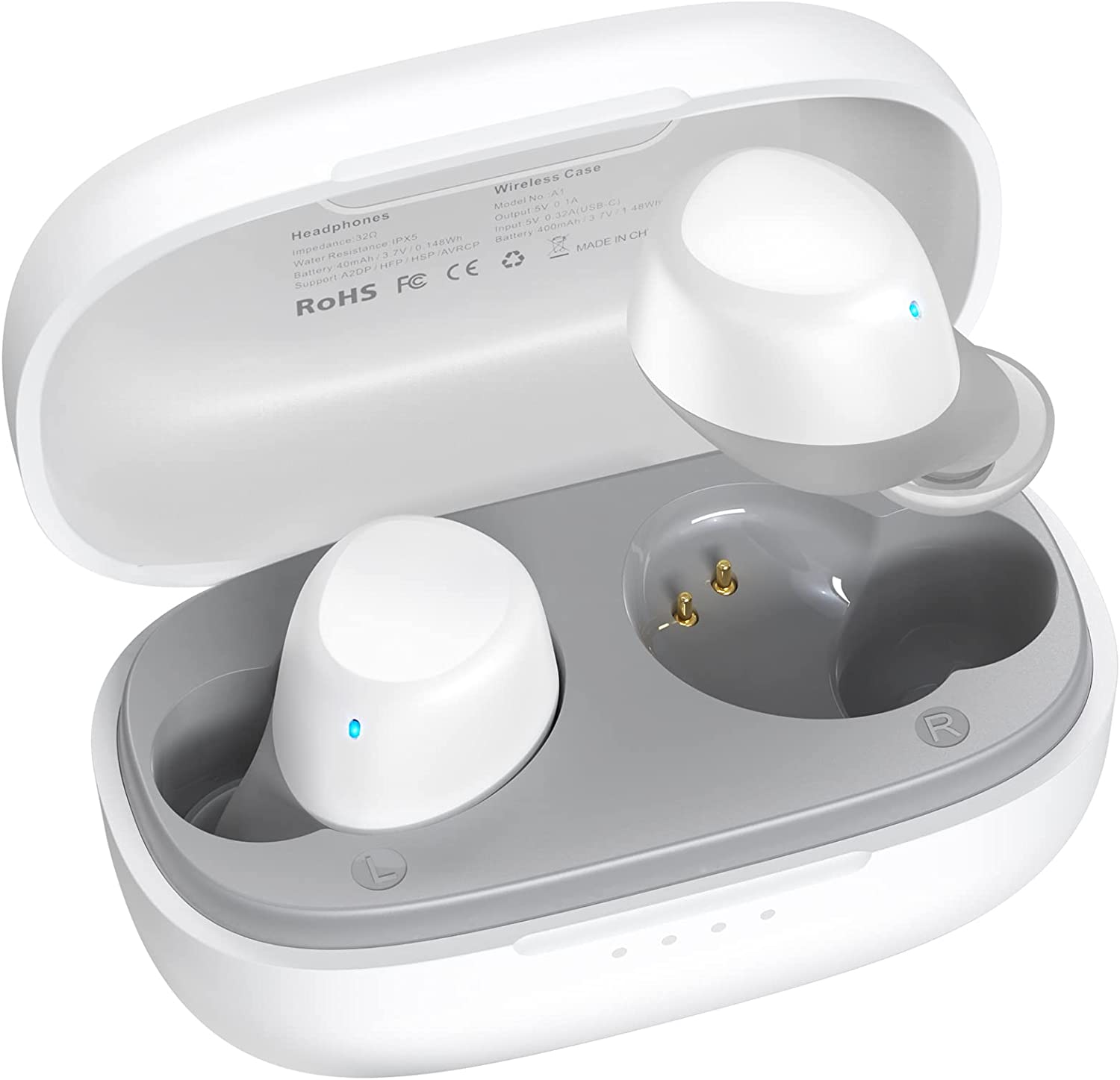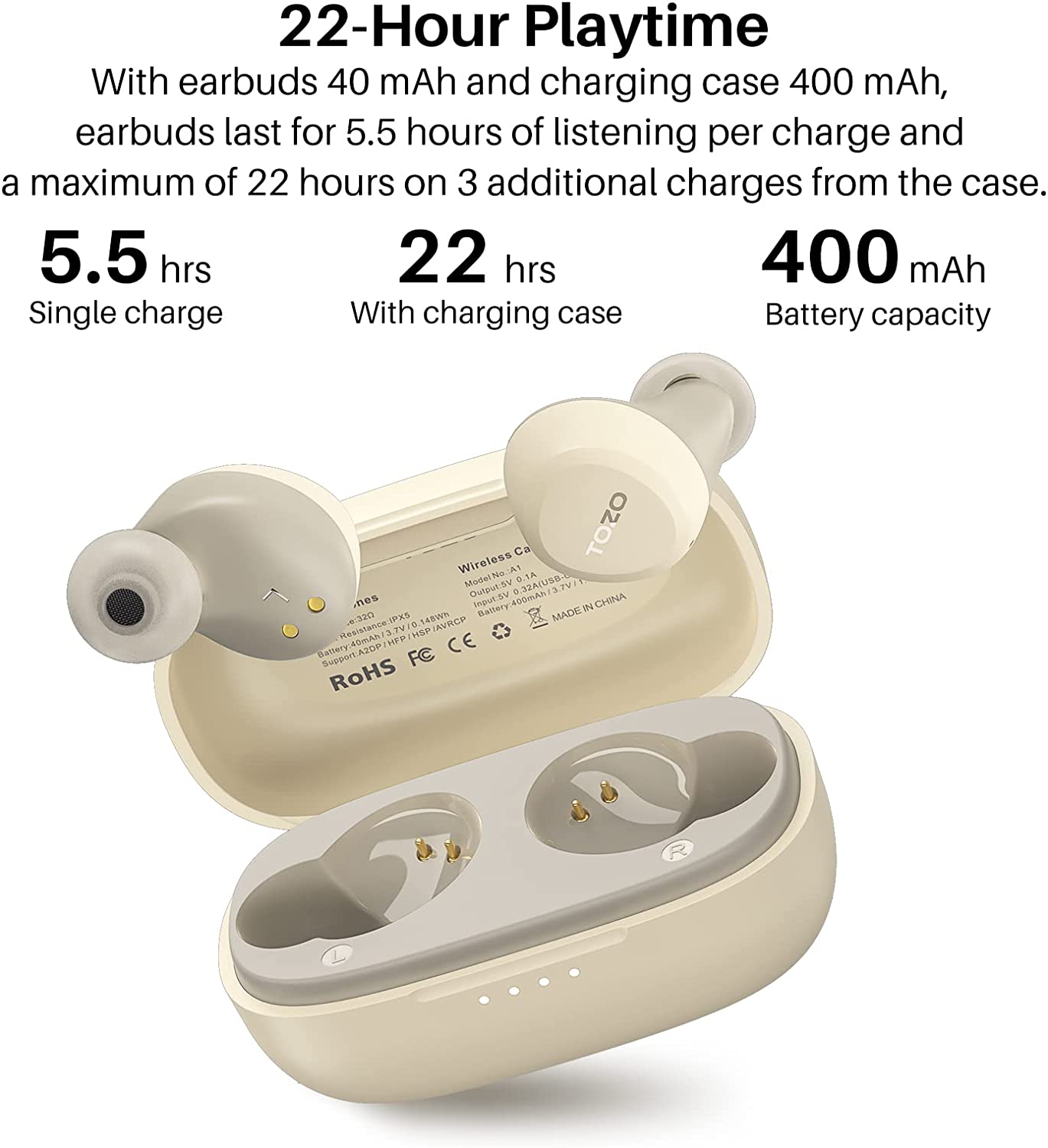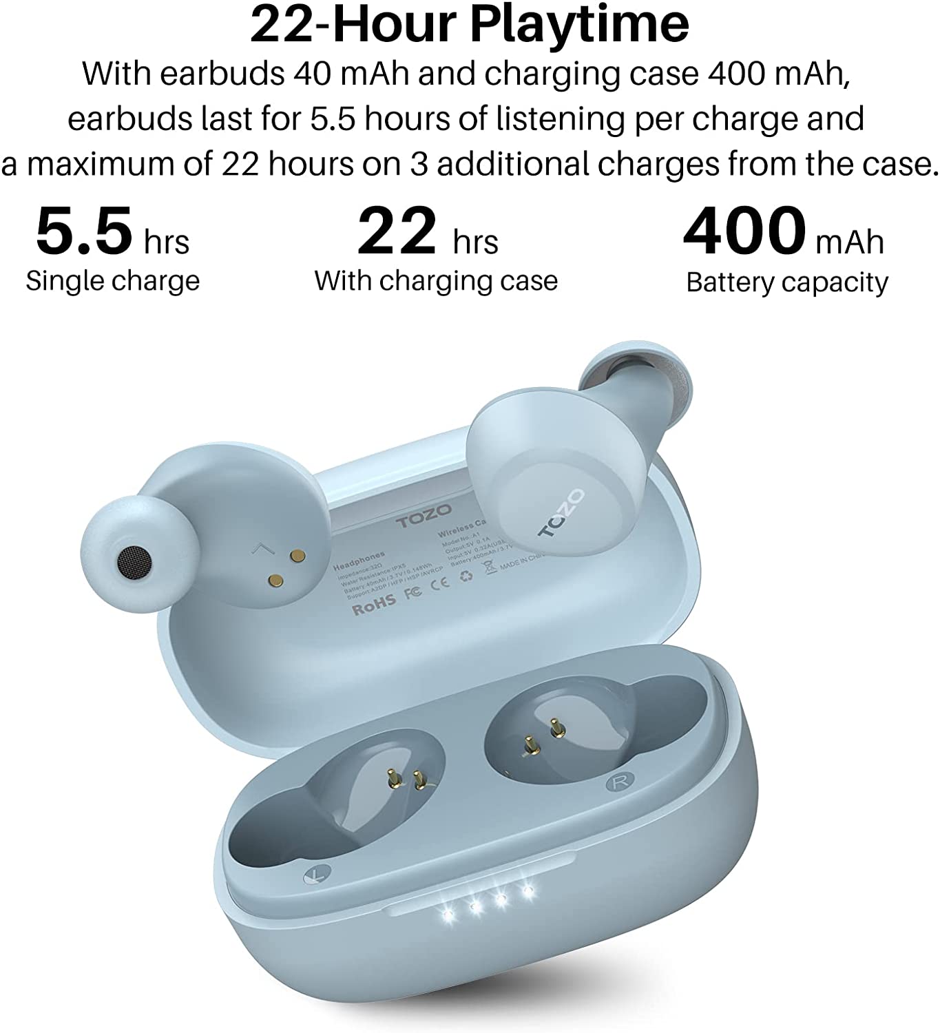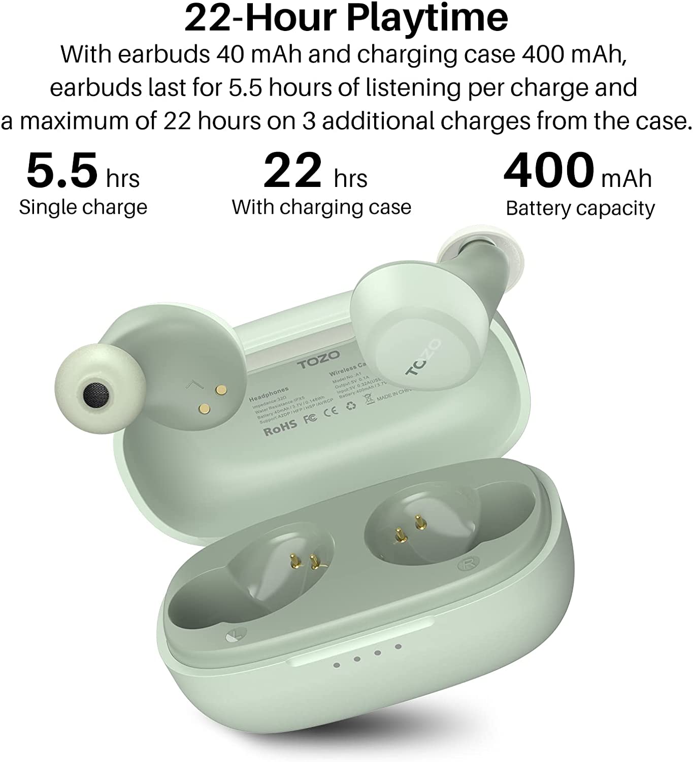 • [Long Battery Life] With headphone 40mAh capacity and charging bin 400mAh capacity. The earbuds lasts 5.5 hours for normal use (60% volume), and the charging bin lasts 22 hours for 3 charges, which gives you excellent experience of long endurance.