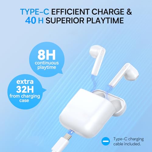 • USB C Efficient Charge for 40 Hours Playtime--Our earbuds have the popular USB C charging cable, which can be easily matched with your power bank, computer, USB socket, etc. Fast charging design. Charge for 1.5 hours, use for 8 hours. With the charging case's backup, it can offer up to 40 hours of playtime