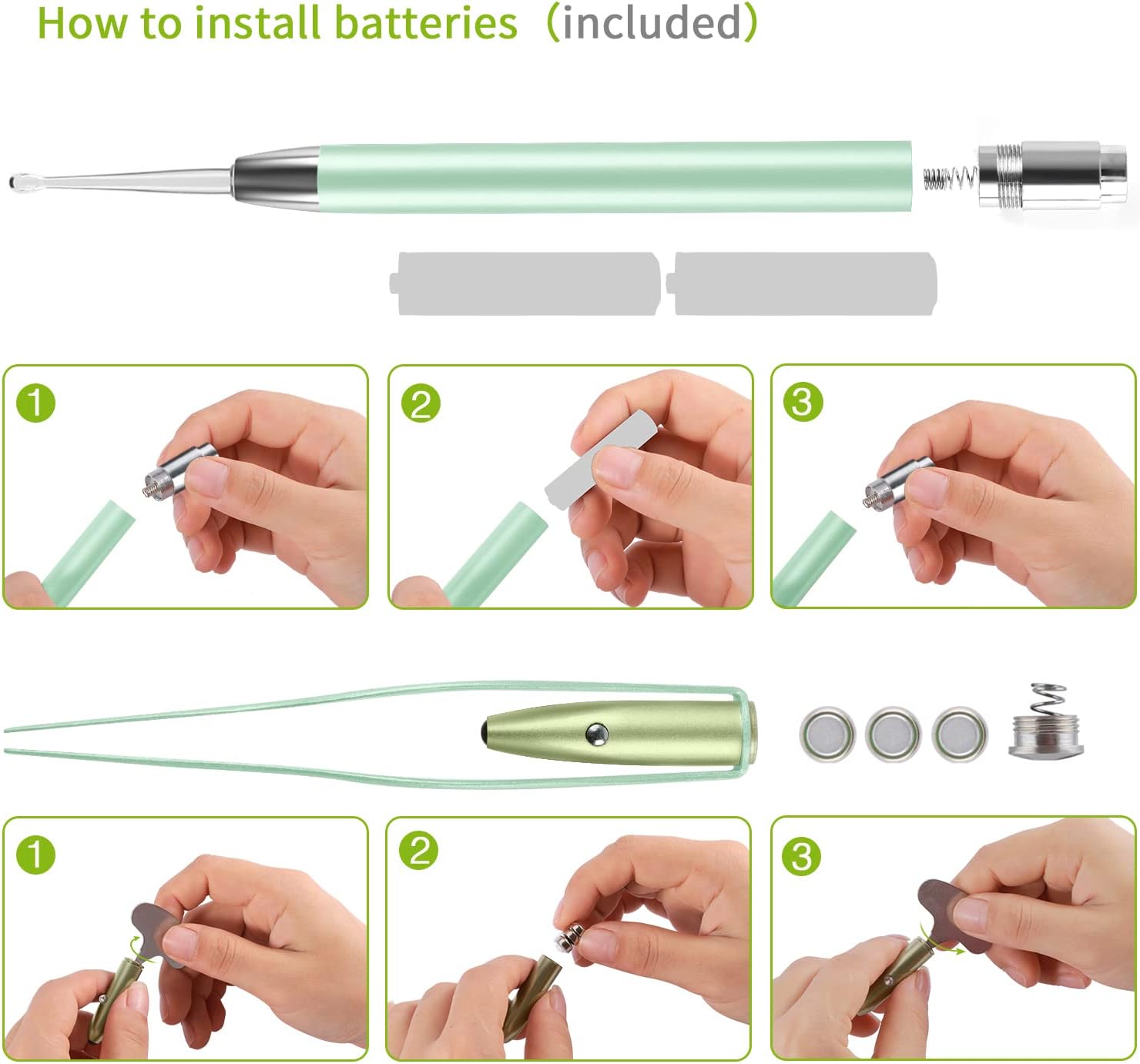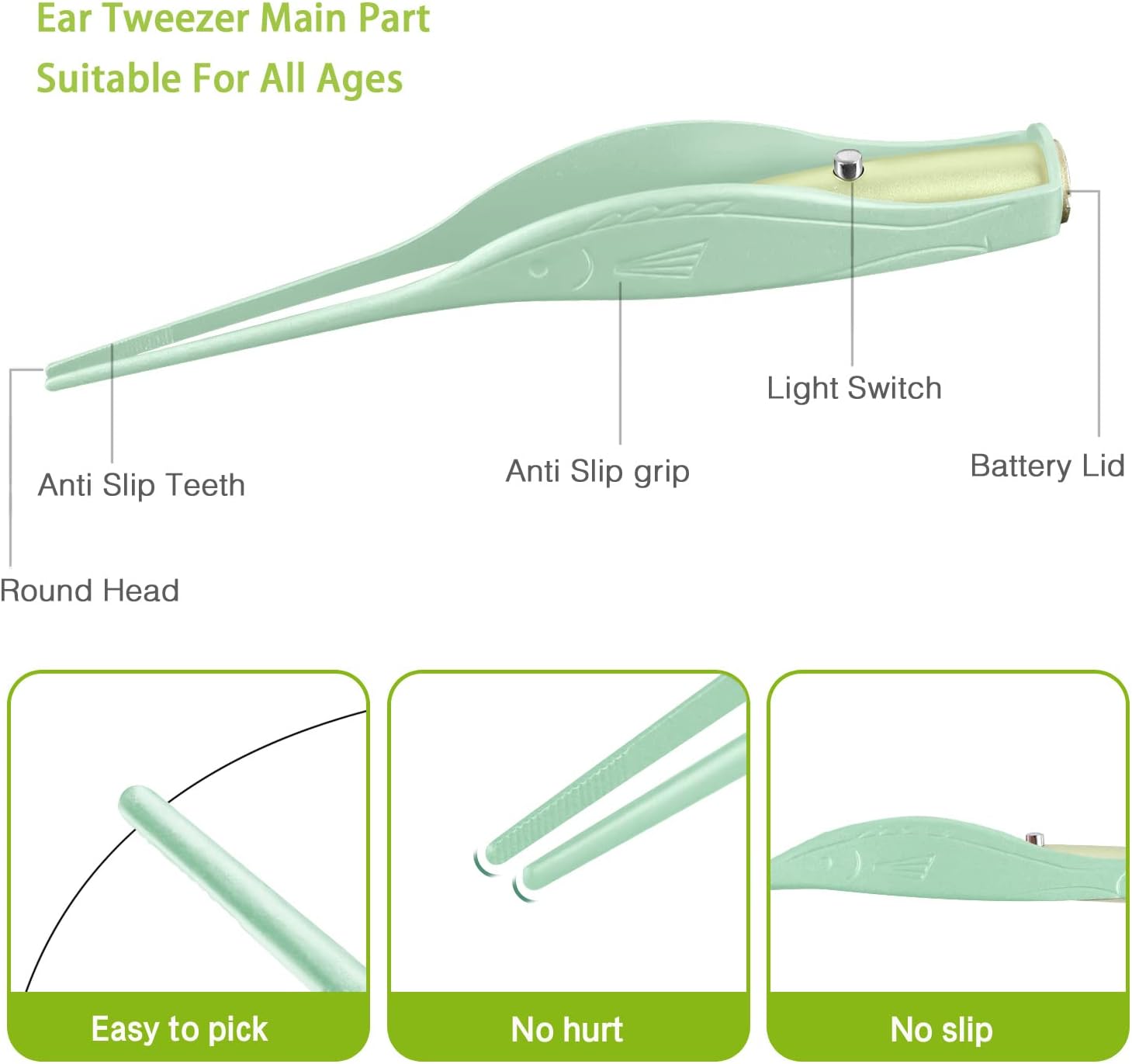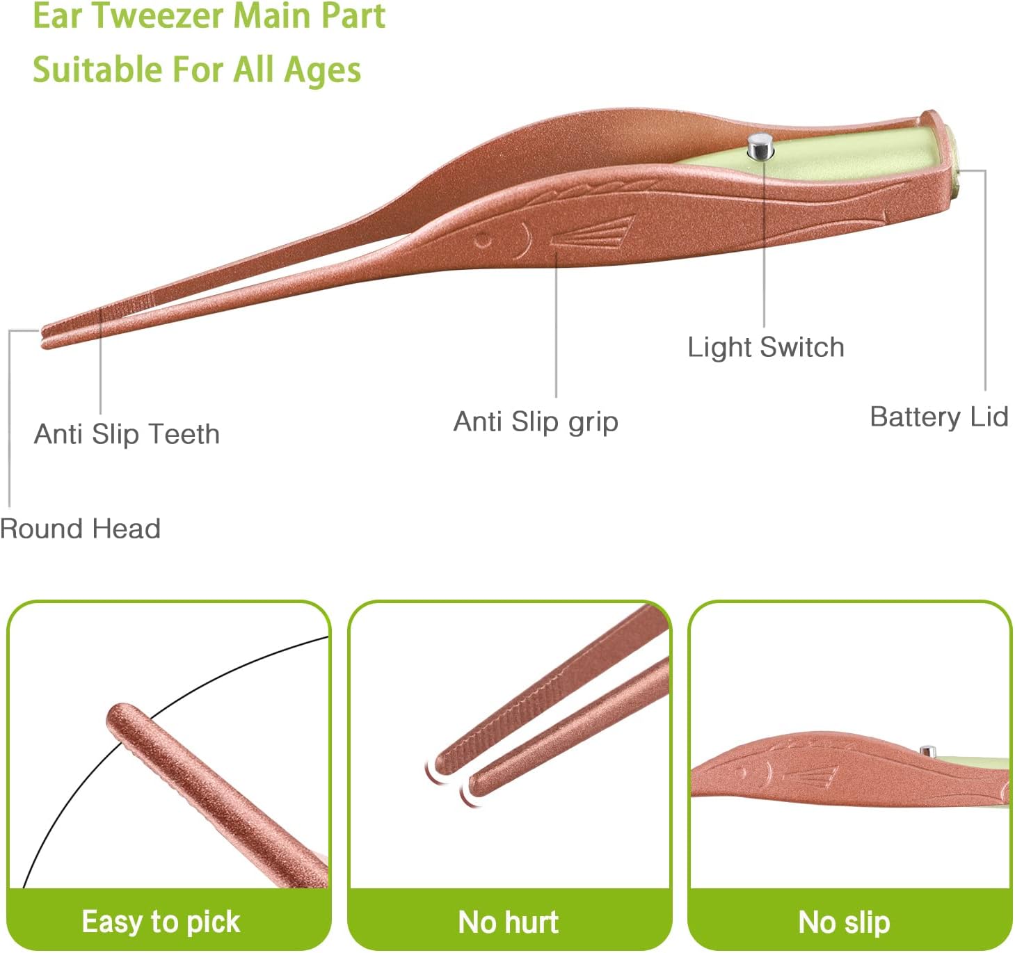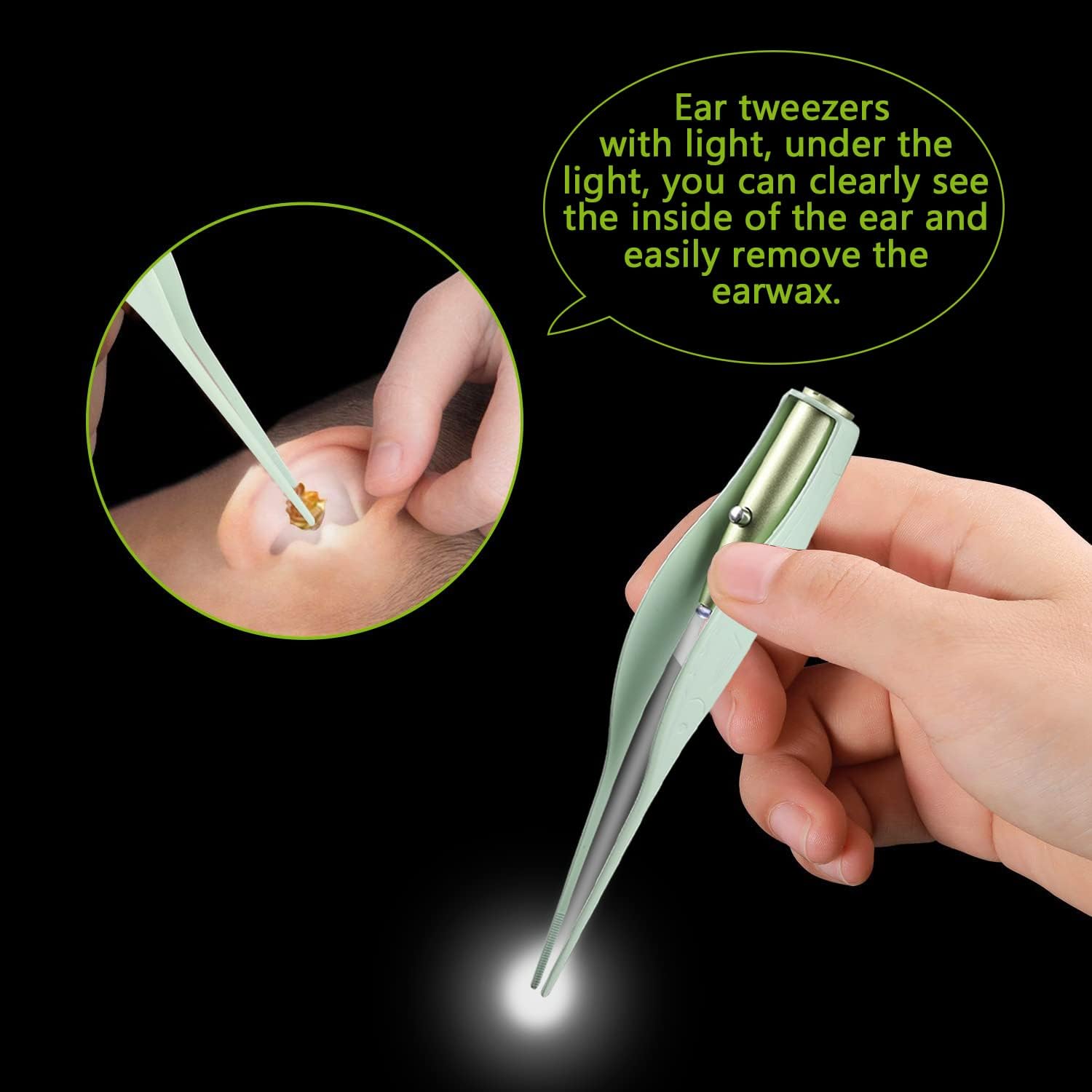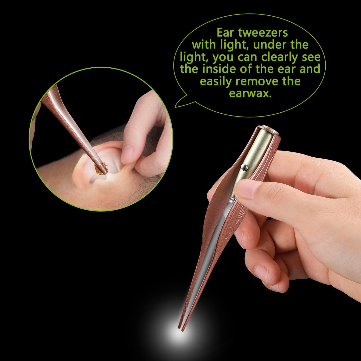 • ✅ LED LIGHT EAR TWEEZERS: Designed to be a practical and easy-to-use for better ear cleaning experience. The tool has very effective tweezers head with anti-slip lines make, useful to pick ear wax. With light on it, makes cleaning more convenient.