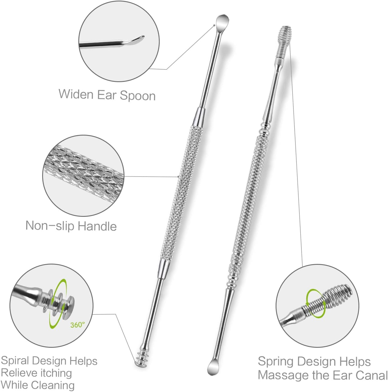• ✅ DOUBLE HEAD EAR PICK: Includes 2 double-ended anti-slip earpicks with unique spring and spiral design, that can effectively relieve itching massage ear canal, gentle and comfortable, cleaning small ear wax, 360° rotate freely and clean the ear wax thoroughly.