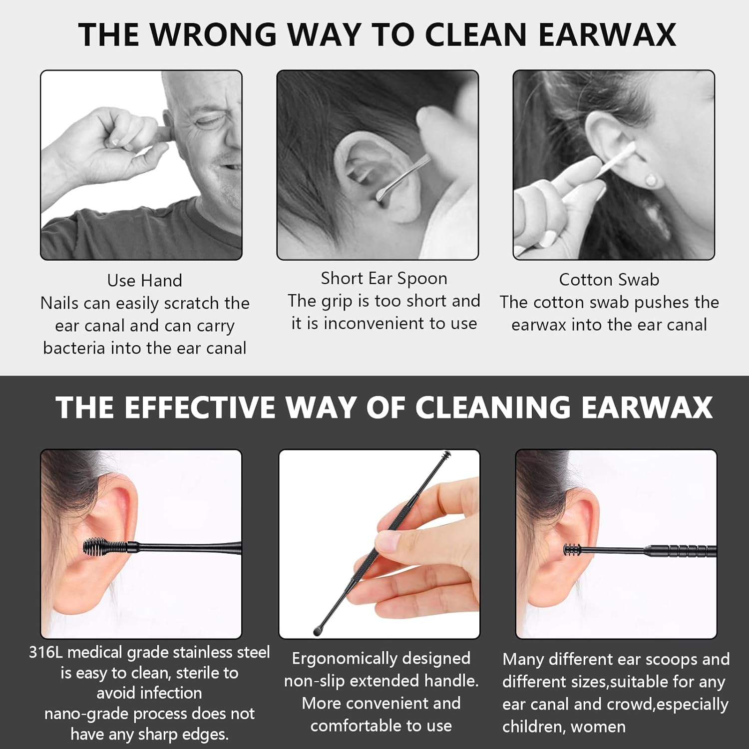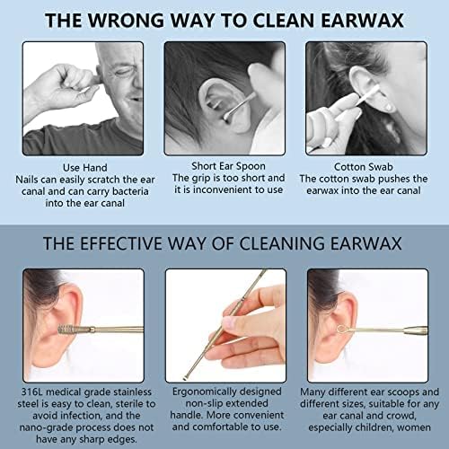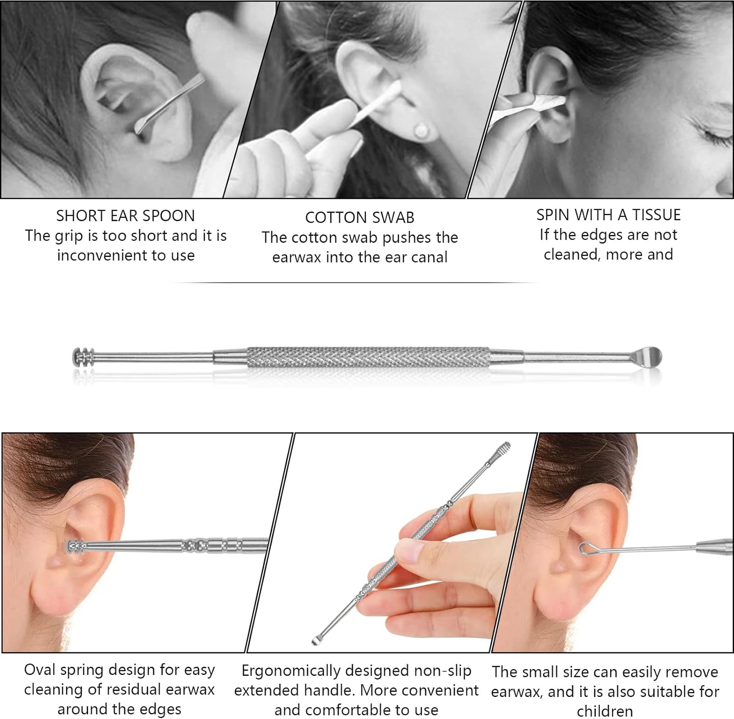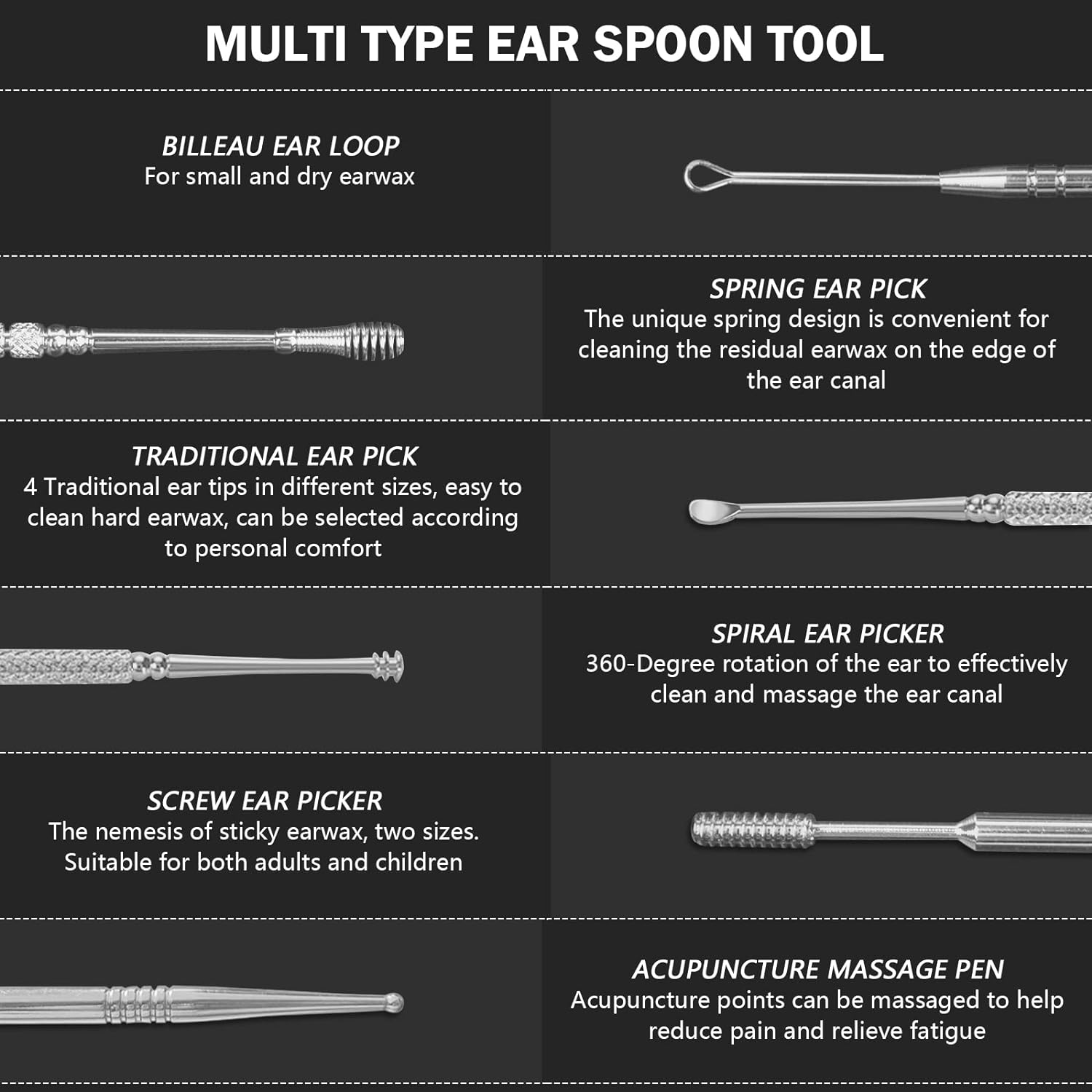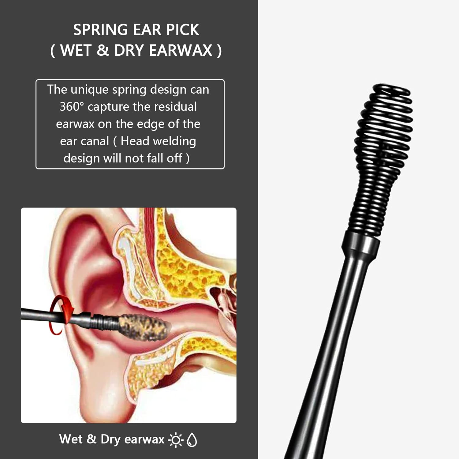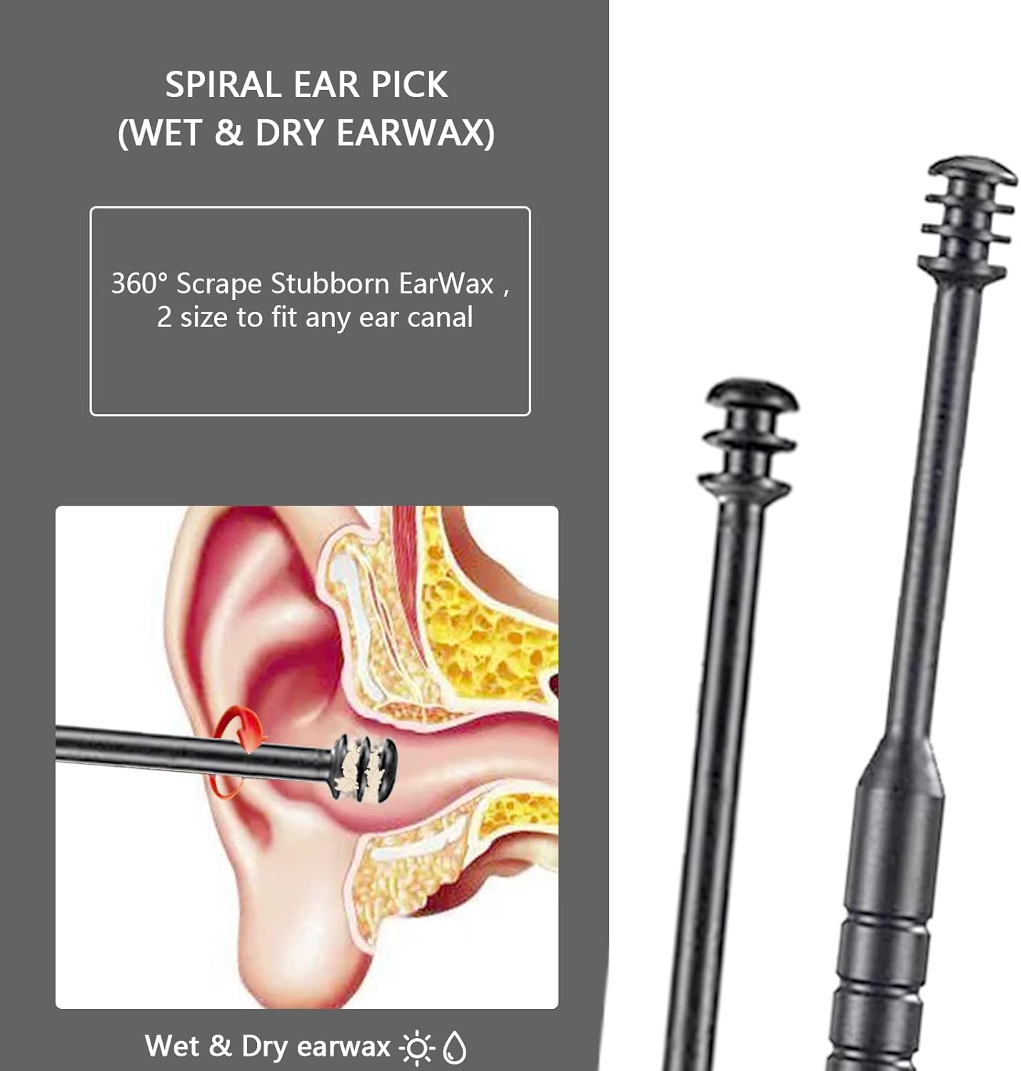 • 【Professional Earwax Removal Tools】 Each ear pick is designed with double-head,and different ear scoops can be used together to remove Dry or Oil earwax perfectly,especially: spring ear picker, screw ear curette,and spiral ear wax remover can remove adhesions in the ear canal 360°The wet earwax on the inner wall massages the ear canal at the same time,and billeau ear loop can easily remove larger Dry earwax.