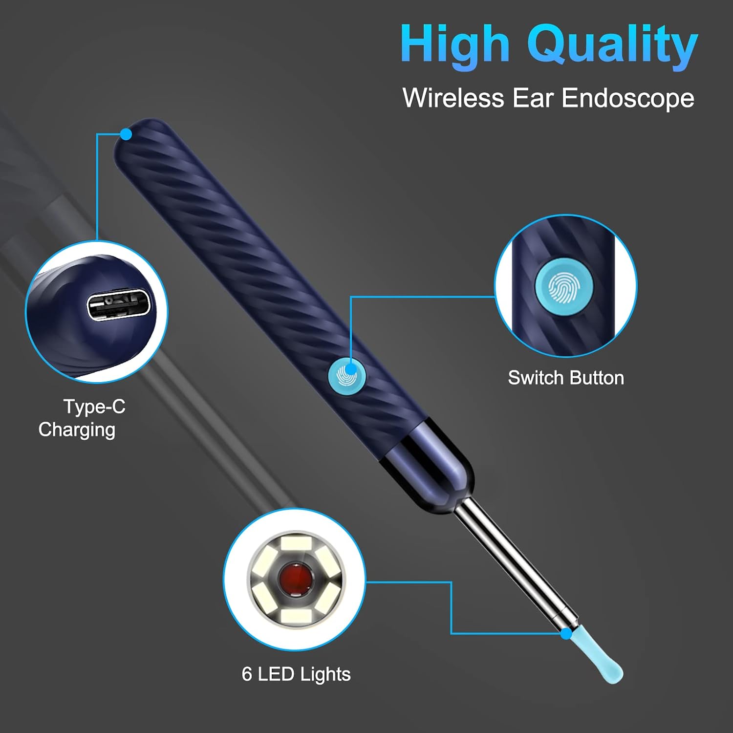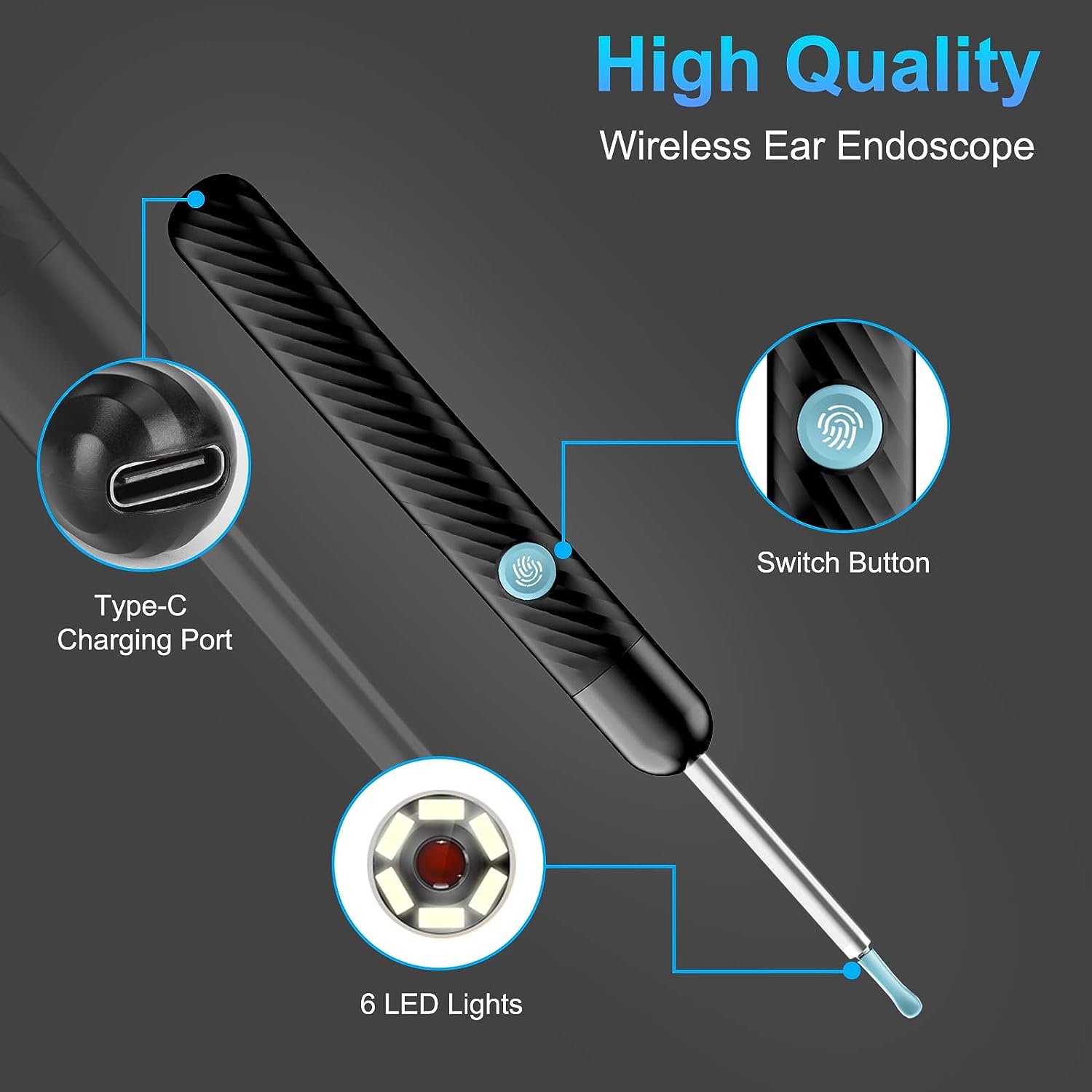 • Packing: Otoscope with light X 1, charging cable X 1, ear pick accessories X 5, ear pick storage bottle X 1, earwax removal 8-piece set (Black), instruction manual.