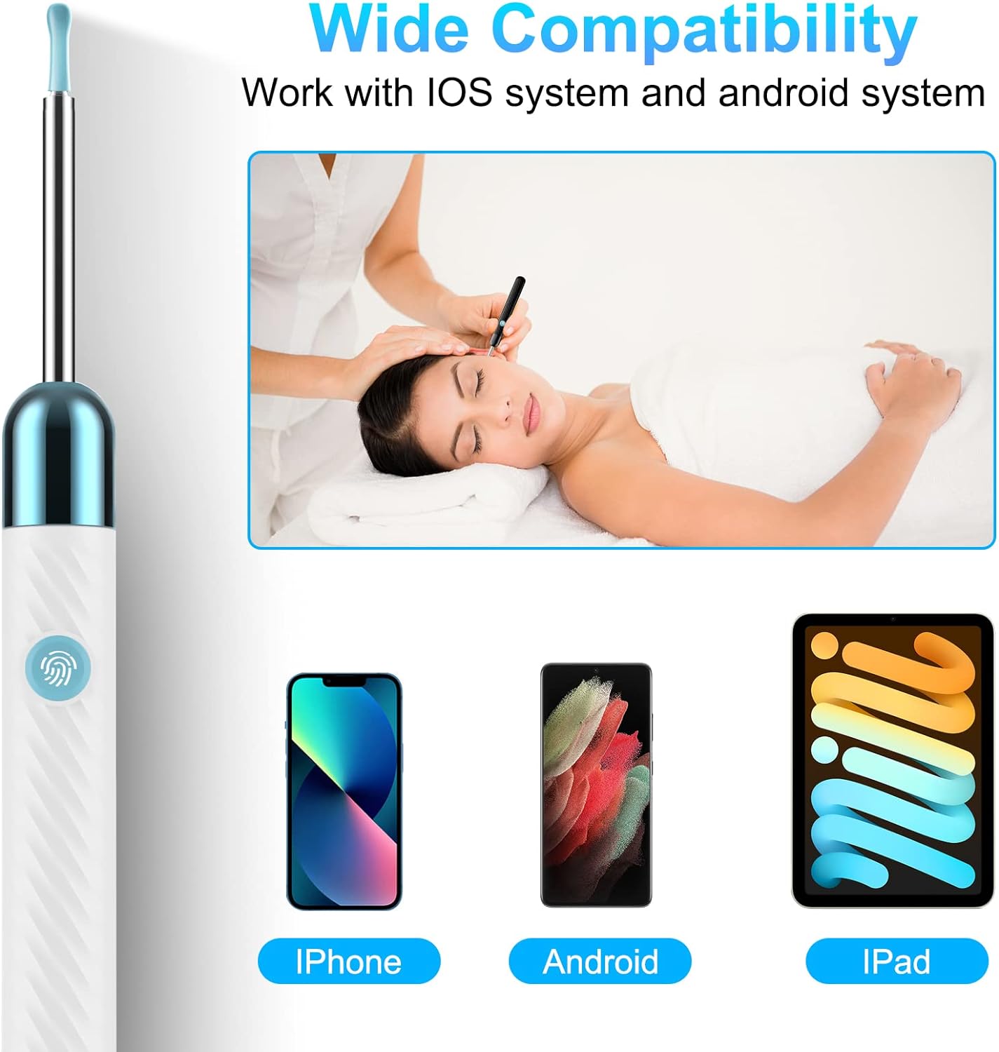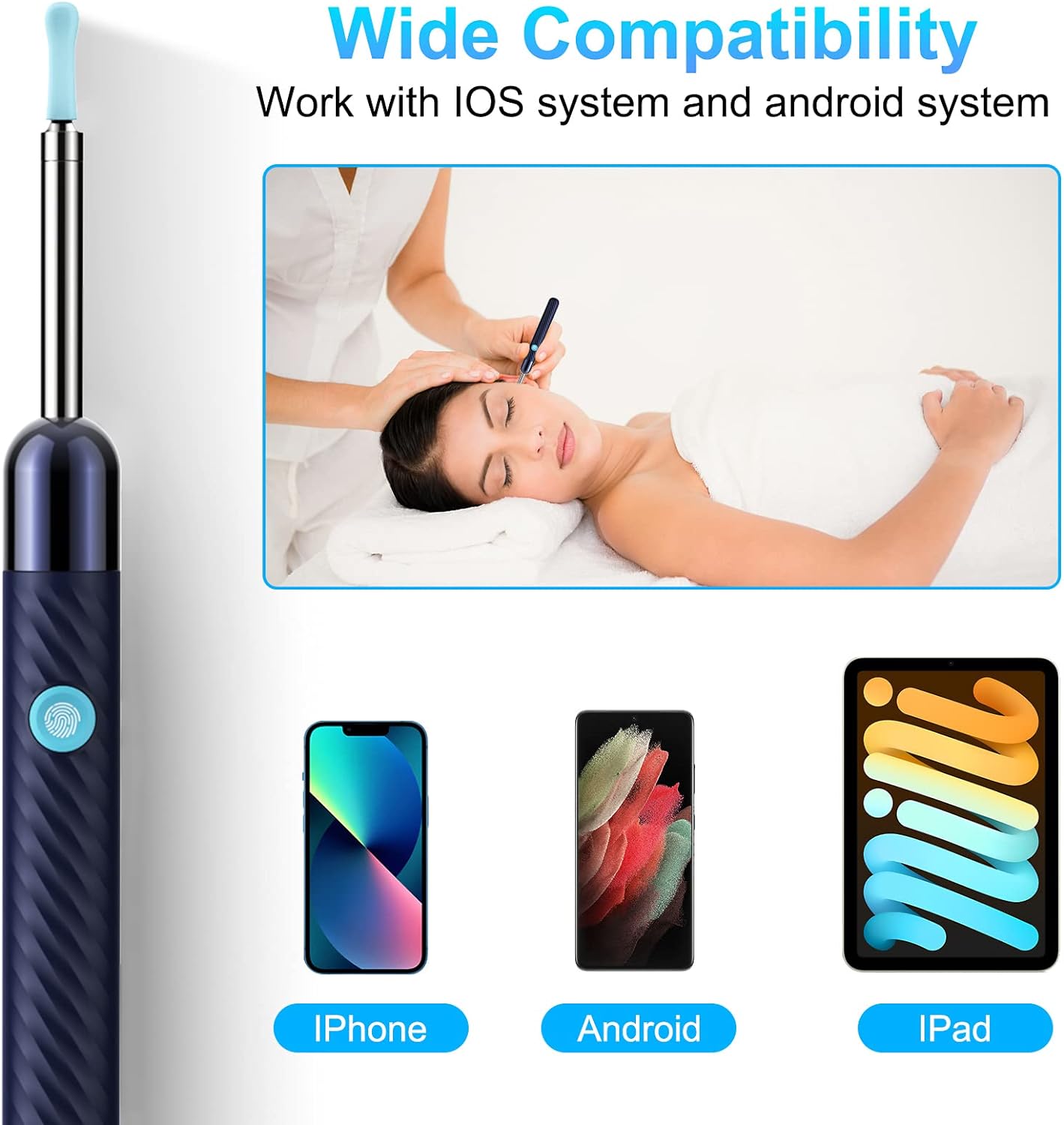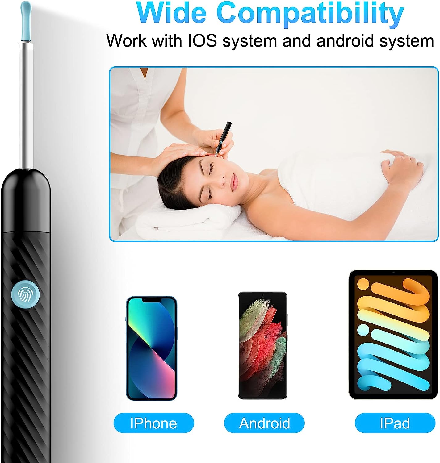 • Support IOS, Android, Other Systems: Scan the QR code and download the APP. Press and hold the ear wax removal with camera switch button for 3 seconds to turn on, and connect to the ear wax camera via WIFI to start using it. Bluetooth connections are not supported. The built-in WIFI does not have Internet capabilities and will not access your data. Please use it with confidence.