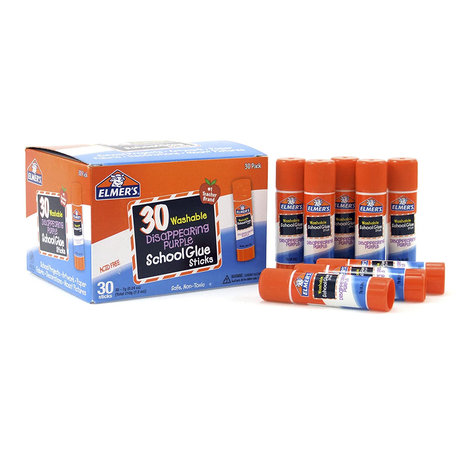 Elmer's Disappearing Purple School Glue Sticks--The Elmer's Disappearing Purple School Glue Stick, available in a classroom-ready pack of 30, goes on smoothly and is great for kids. The Disappearing Purple formula goes on purple, so it is easy to see and dries clear. It is safe, non-toxic, and a must have for all students.