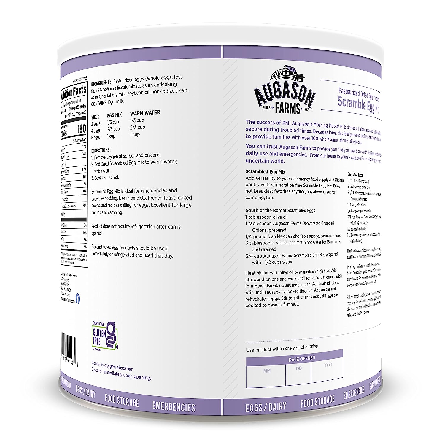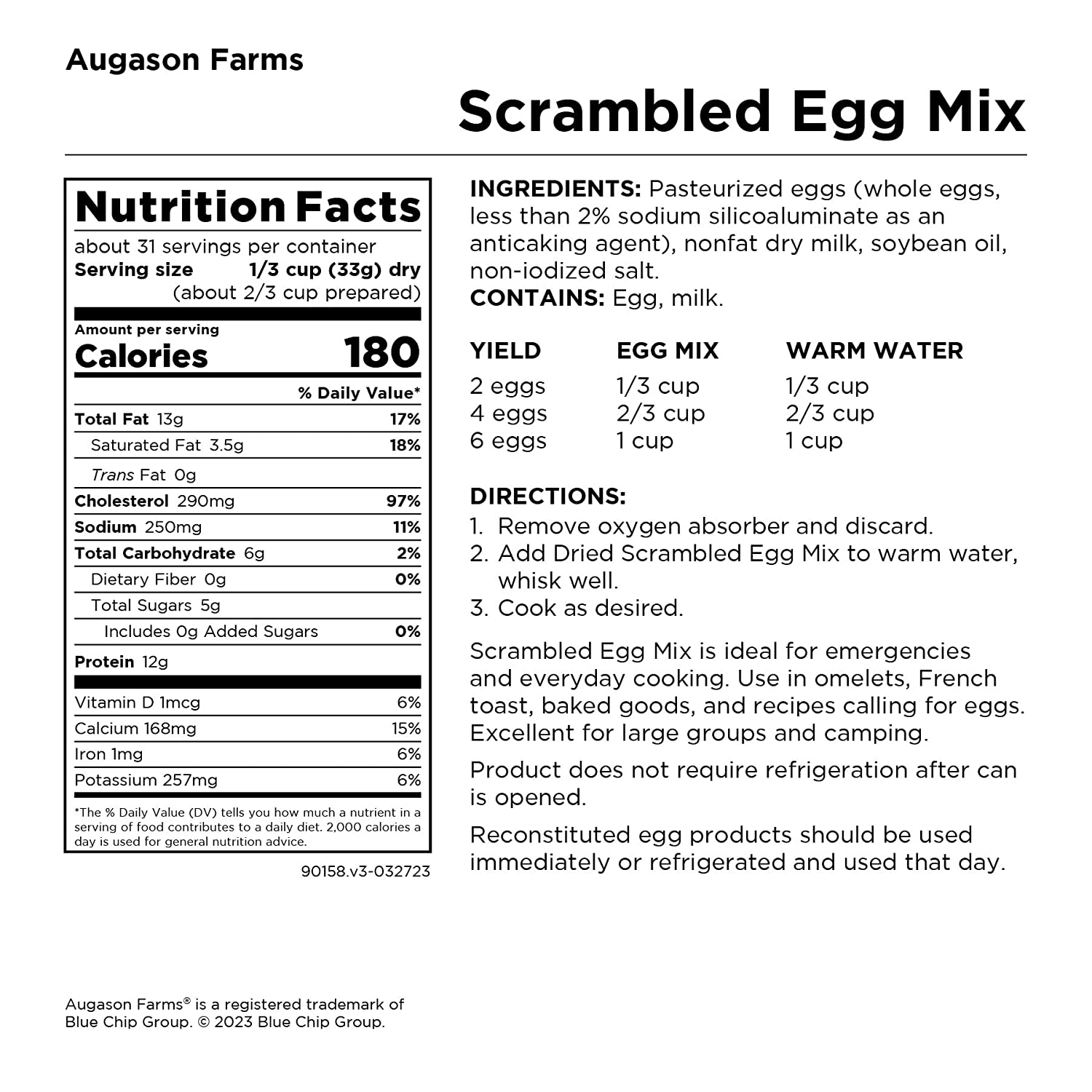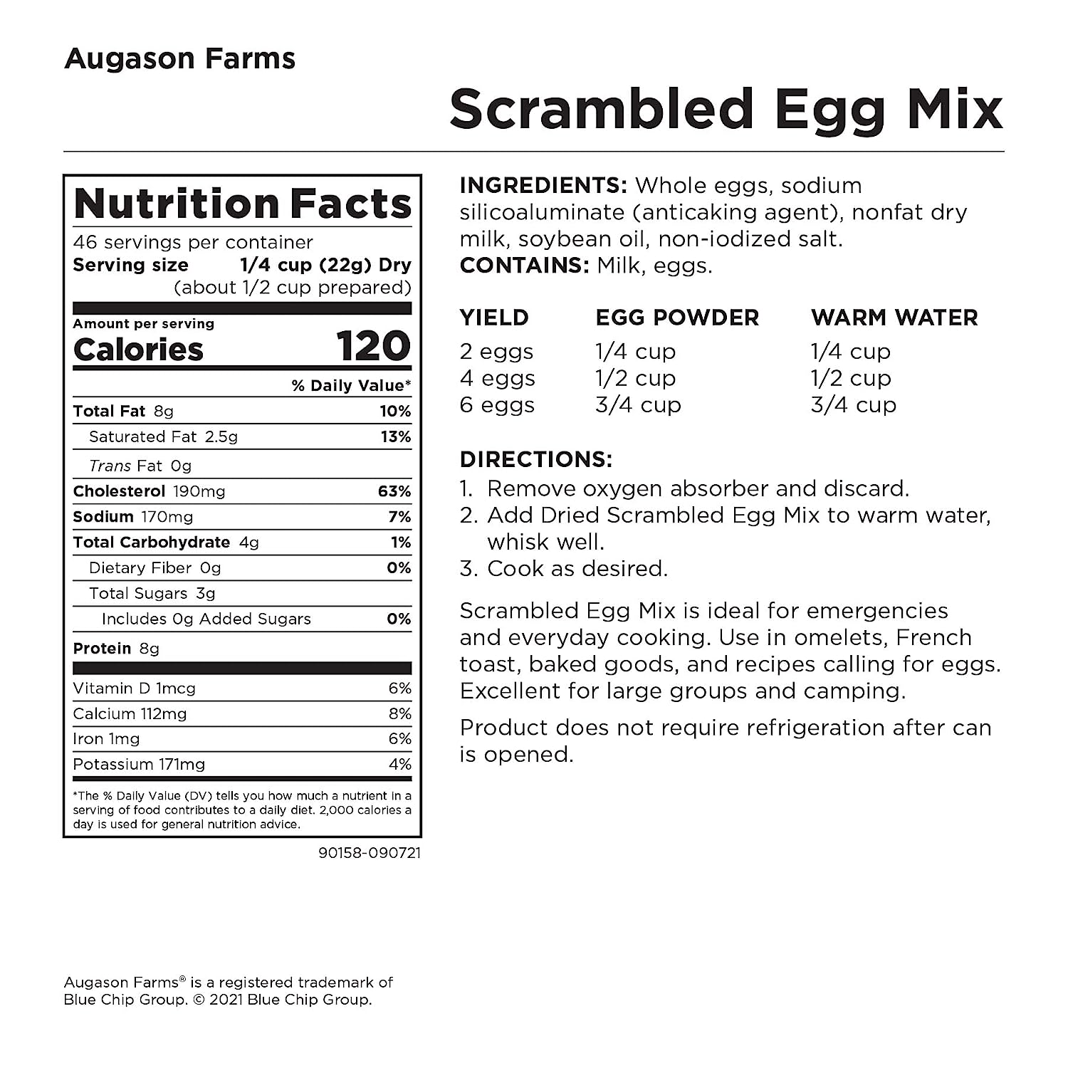 Augason Farms Scrambled Egg Mix is made with real dried whole egg powder plus dried non-fat dry milk, vegetable oil, and salt. It's your shortcut to great-tasting scrambled eggs, omelets, French toast, and other breakfast favorites. Certified gluten-free.
