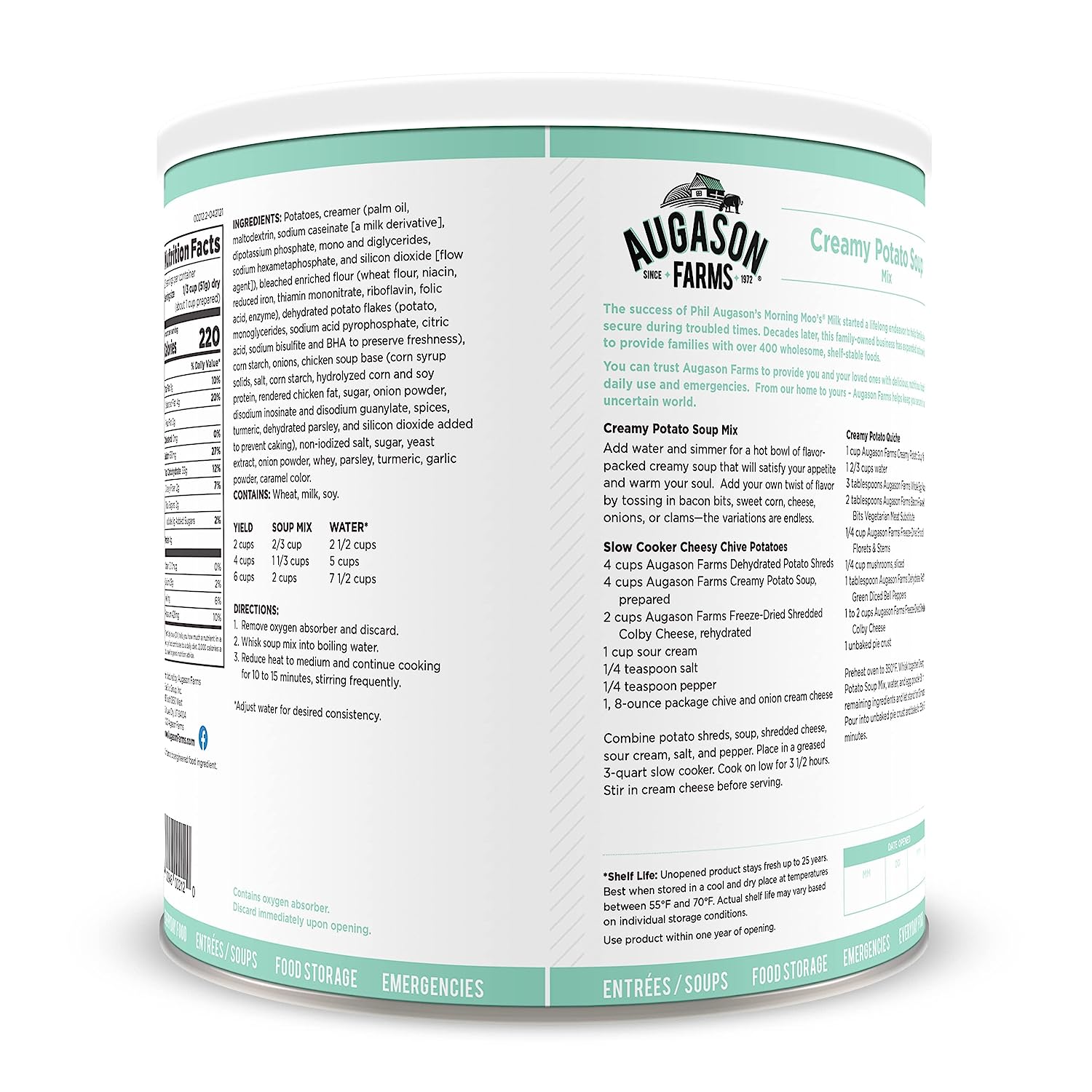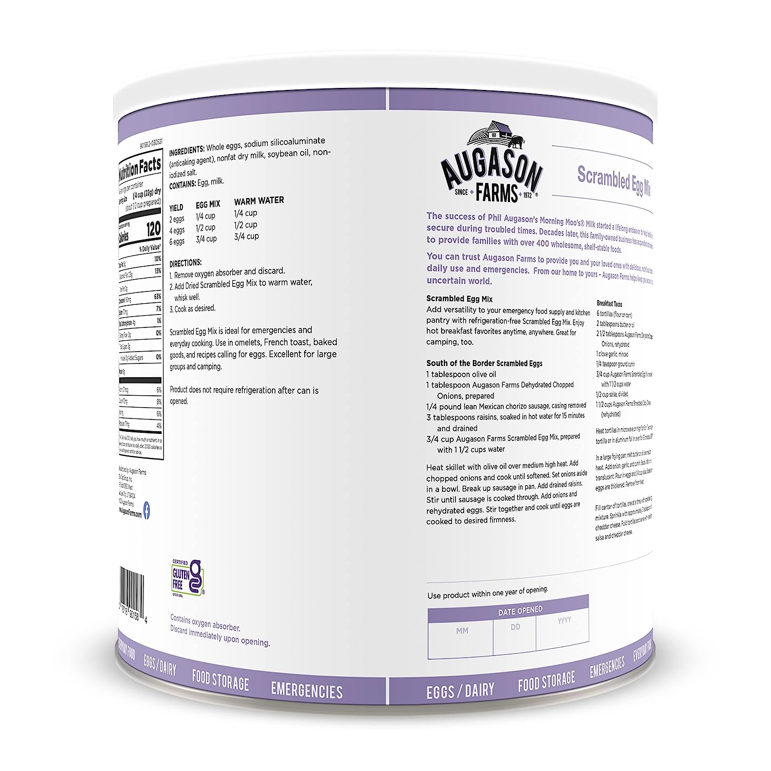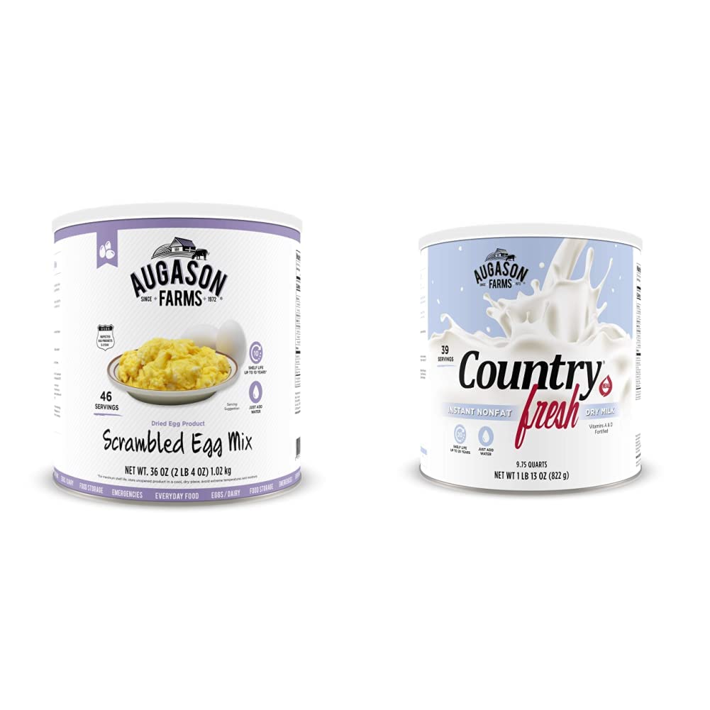 Augason Farms Scrambled Egg Mix is made with real dried whole egg powder plus dried non-fat dry milk, vegetable oil, and salt. It's your shortcut to great-tasting scrambled eggs, omelets, French toast, and other breakfast favorites. Certified gluten-free.