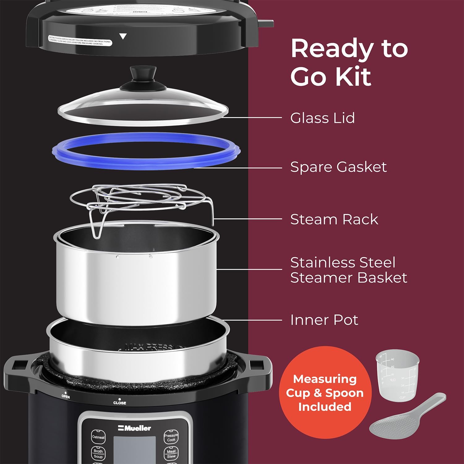 Mueller UltraPot 10-in-1 Pressure Cooker 6 Quart with 8 Safety Features, Rice Cooker, Slow Cooker, Saute, Yogurt Maker, Custom & Pre-Set Functions, Tempered Glass Lid