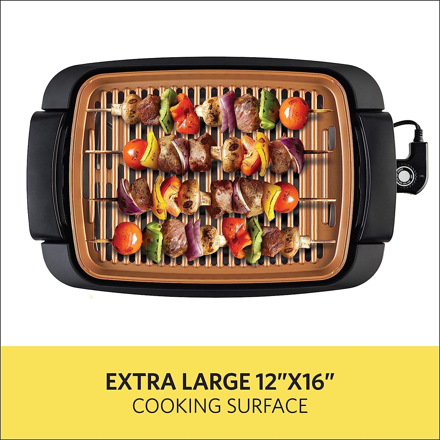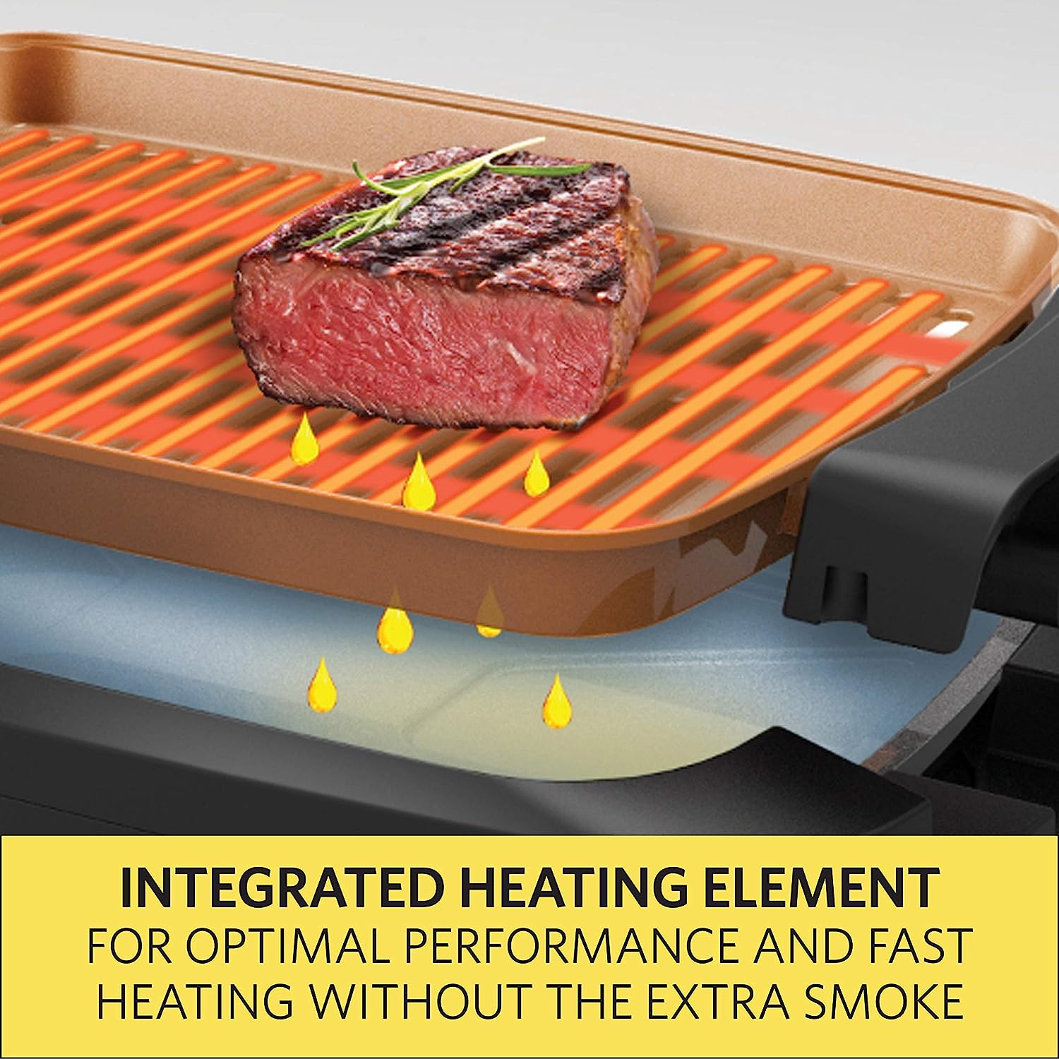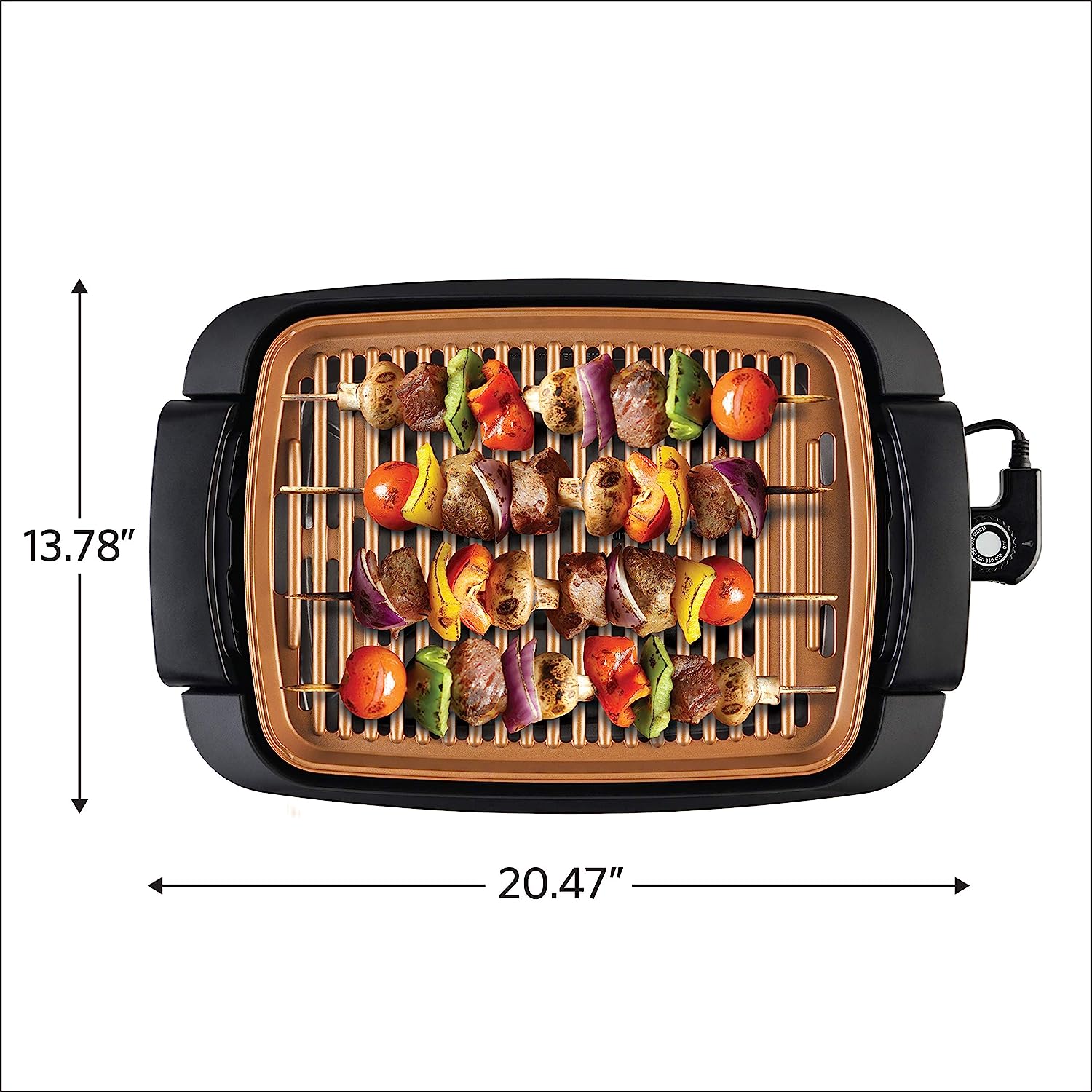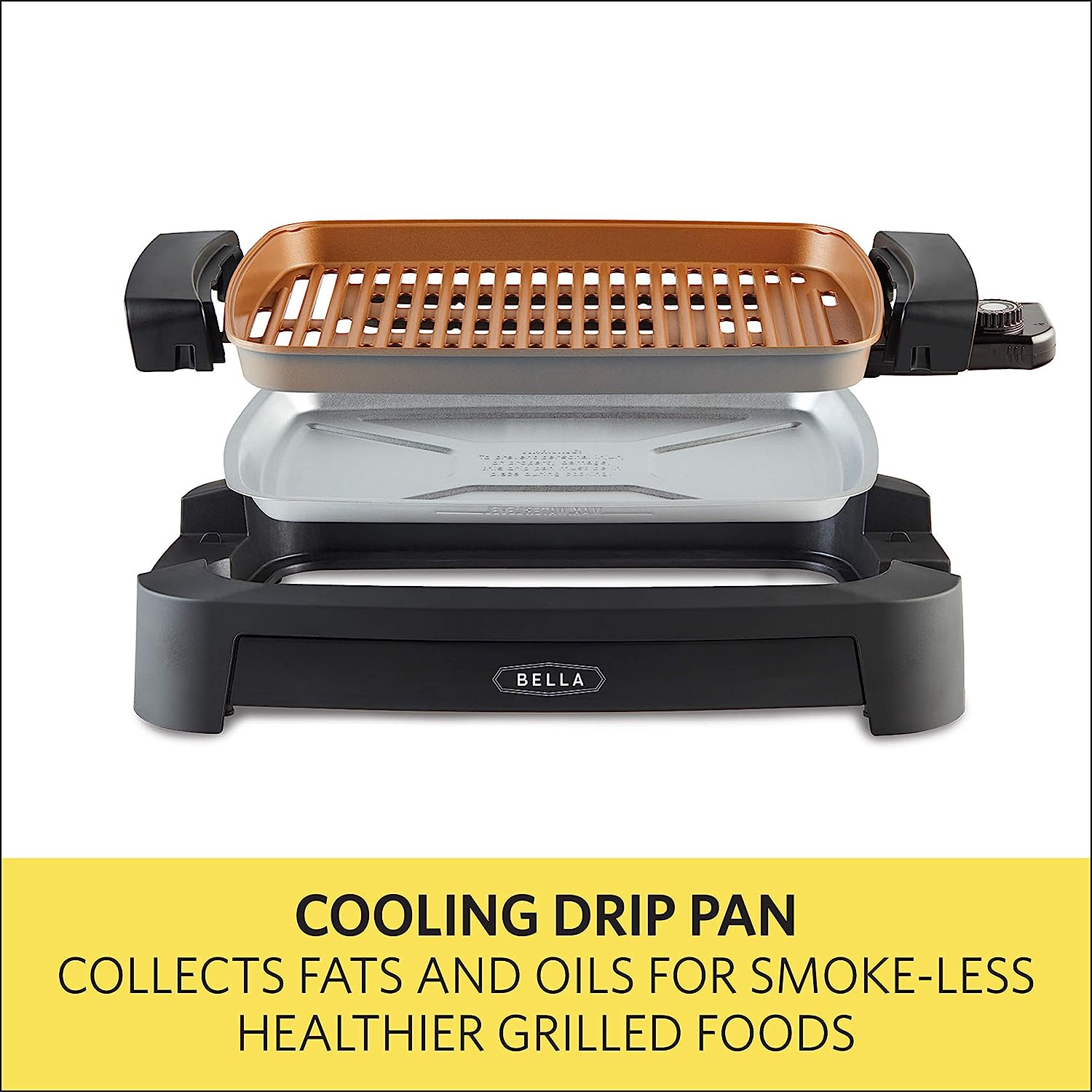 No need to fire up the BBQ, or wait for that perfect sunny day, to enjoy your BBQ favorites. The BELLA 12” x 16” Smokeless Grill is outfitted with a powerful heating system and specialized cooling drip pan which allow you to grill up burgers, steaks, skewers and more without the smoke of an outdoor BBQ. The simple technology of this indoor grill consists of an integrated heating element and cooling drip pan which prevents the production of smoke seen in regular outdoor BBQs. Enjoy grilling up steaks, potatoes, veggies, or burgers all year round for your friends and family. The convenient cool touch handles provide added safety and the dishwasher safe cooking plate with premium copper nonstick coating makes cleaning up a breeze!