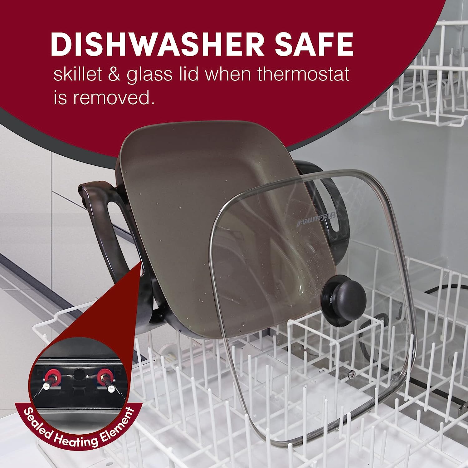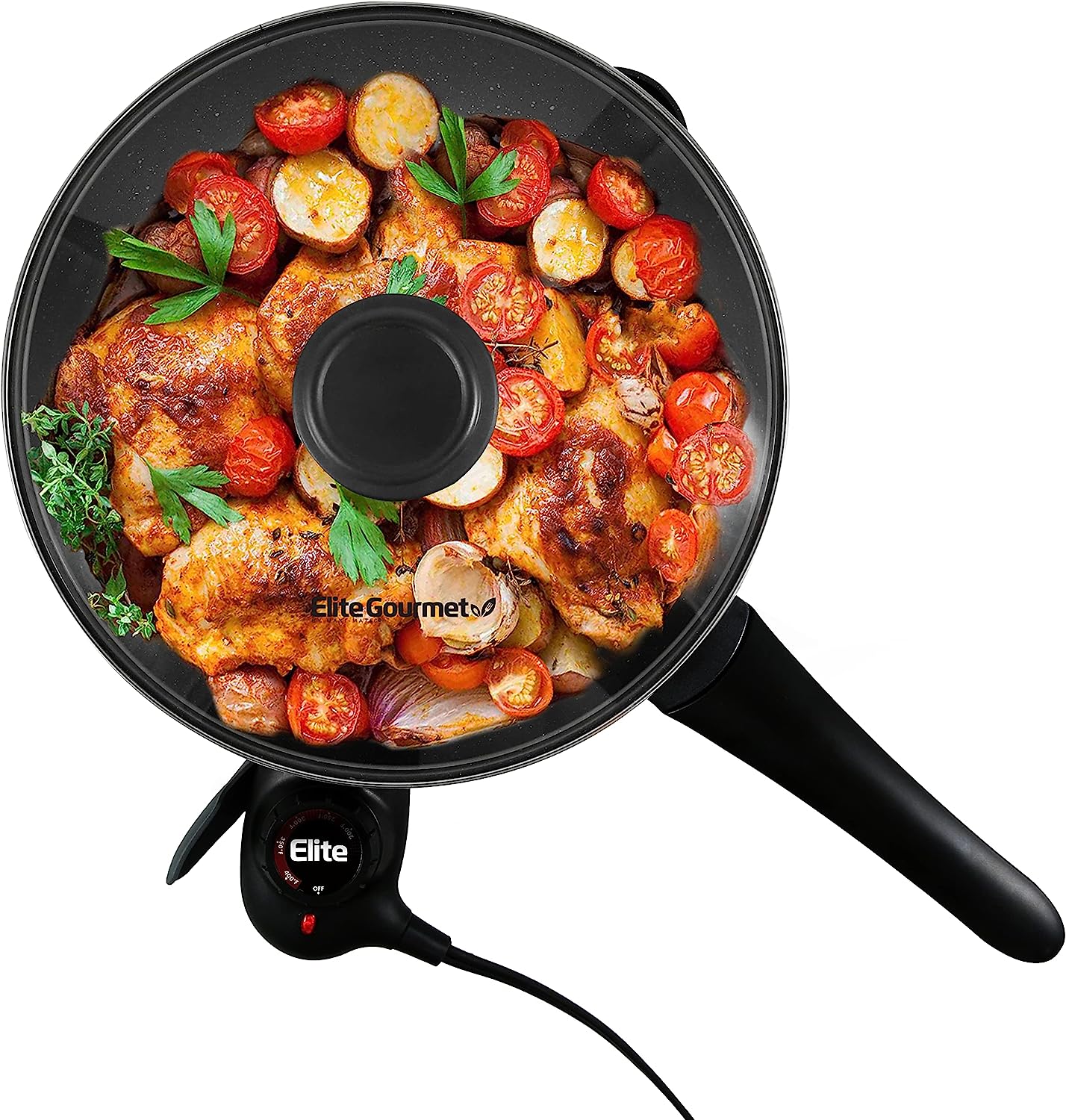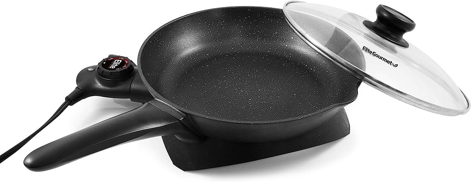 The Elite Gourmet 12”x 12” Titanium-Ceramic Non-stick Electric Skillet is one of the most versatile and convenient small kitchen appliances you can own. Prepare a variety of tasty meals in minutes and without using multiple pots, pans or appliances. With a durable Titanium Ceramic cooking surface and cast-in heating element, clean-up of our fully immersible skillet is easy (upon removal of the temperature control). Cook and serve up sumptuous meats, vegetables, soups, chili, stir-fry, desserts and many more foods for your entire family & friends. The Electric Skillet features a variable-temperature dial with a 200-425°F degree range, as well as an indicator light to let you know when power is on and desired temperature is achieved. Tall sides and a glass lid keep moisture in and protect against splatters as you monitor cooking. With its cool-touch handles you can safely tip the skillet to drain juices for soups and gravy. The Elite Gourmet 12" Ceramic Titanium Coated Electric Skillet lets you prepare meals without heating up the entire kitchen making it one of the most cost-effective of kitchen accessories.