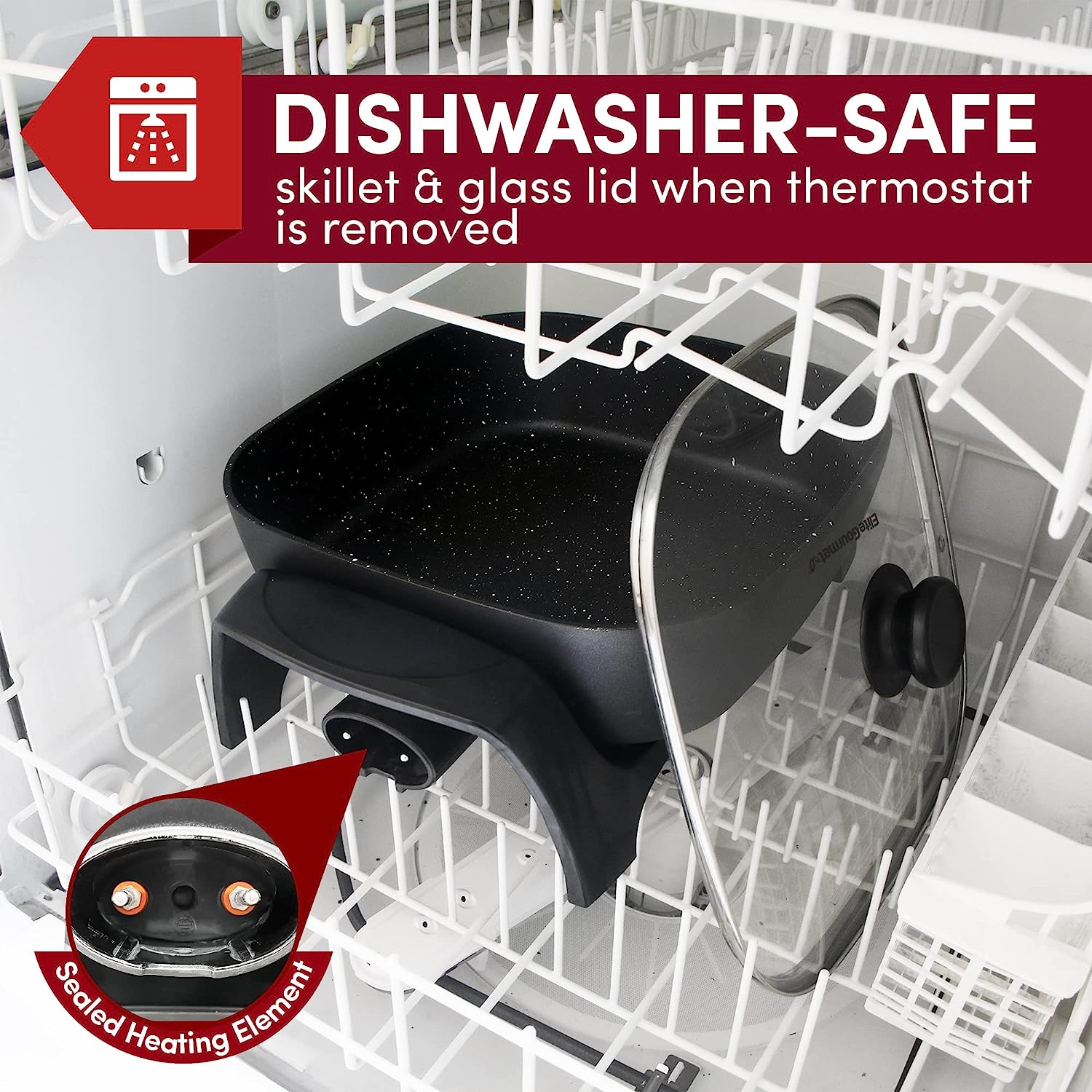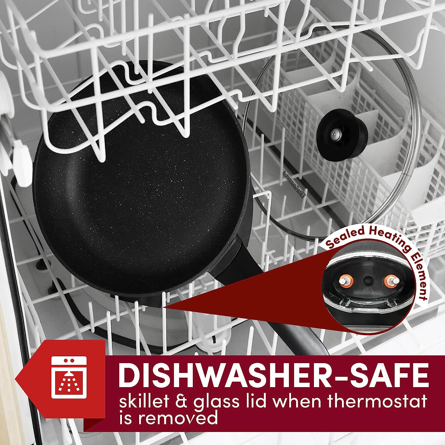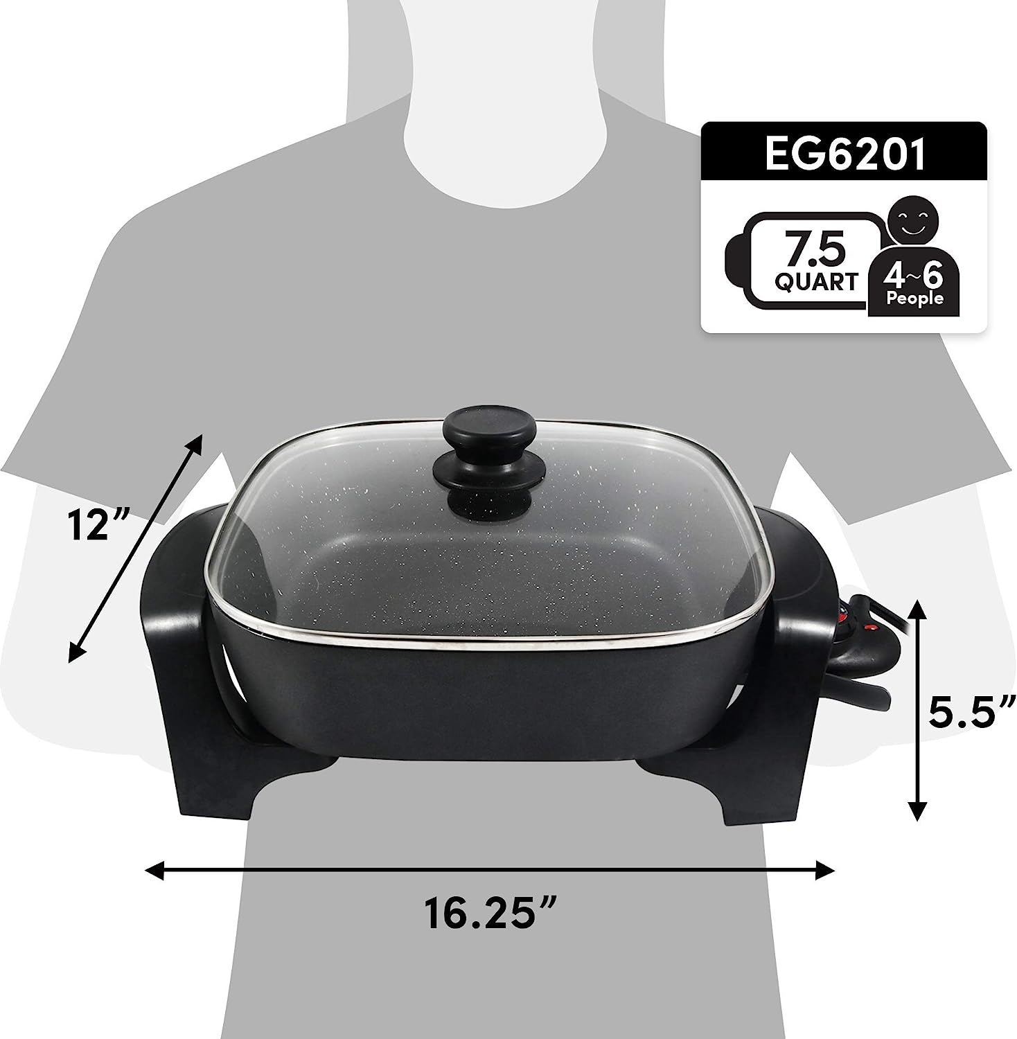 The Elite Gourmet 12”x 12” Titanium-Ceramic Non-stick Electric Skillet is one of the most versatile and convenient small kitchen appliances you can own. Prepare a variety of tasty meals in minutes and without using multiple pots, pans or appliances. With a durable Titanium Ceramic cooking surface and cast-in heating element, clean-up of our fully immersible skillet is easy (upon removal of the temperature control). Cook and serve up sumptuous meats, vegetables, soups, chili, stir-fry, desserts and many more foods for your entire family & friends. The Electric Skillet features a variable-temperature dial with a 200-425°F degree range, as well as an indicator light to let you know when power is on and desired temperature is achieved. Tall sides and a glass lid keep moisture in and protect against splatters as you monitor cooking. With its cool-touch handles you can safely tip the skillet to drain juices for soups and gravy. The Elite Gourmet 12" Ceramic Titanium Coated Electric Skillet lets you prepare meals without heating up the entire kitchen making it one of the most cost-effective of kitchen accessories.