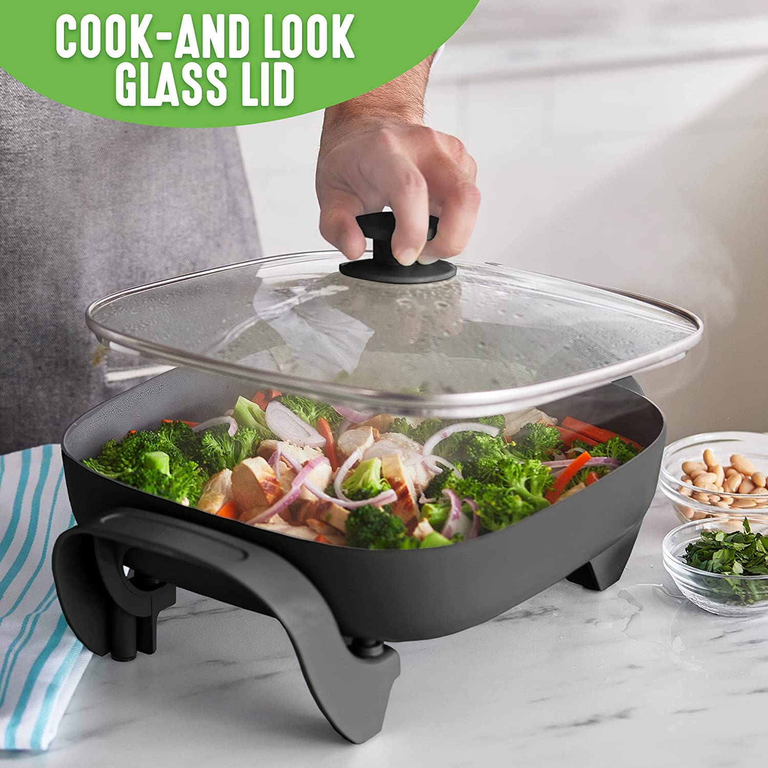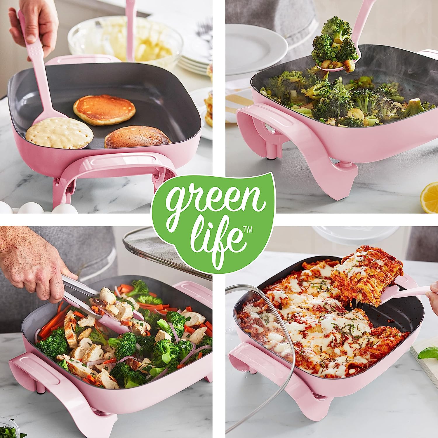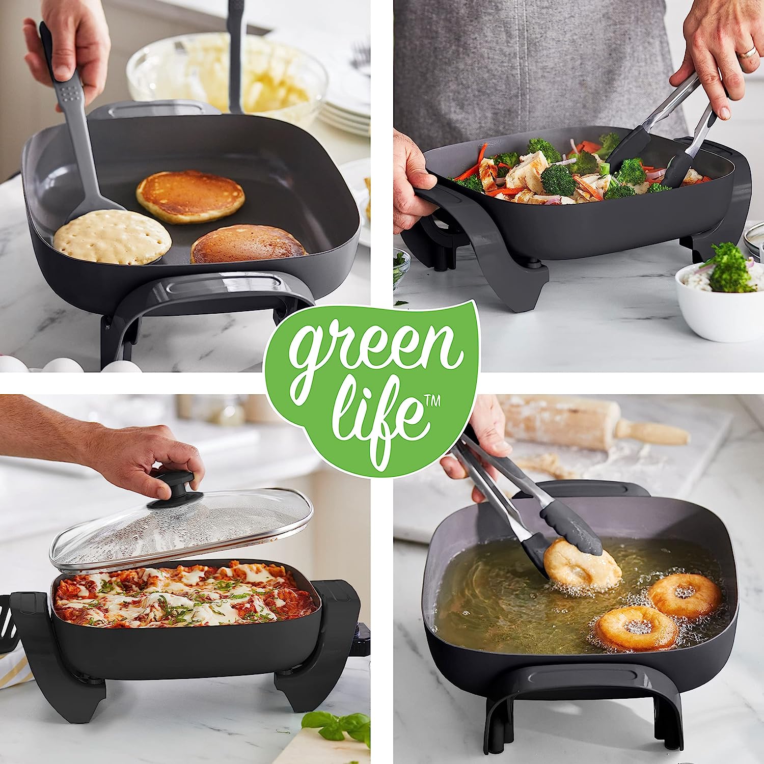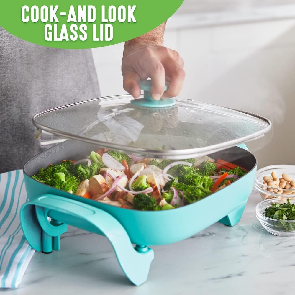 We love our pans, but sometimes the stovetop isn’t the solution. The GreenLife Healthy Power 5-in-1 Electric Skillet brings the power of our pans anywhere with an outlet. Whether you’re in a dorm, camping, the oven makes the kitchen too hot, or you just need an extra burner, this skillet is your do-it-all solution. You can fry, sauté, bake, grill, and steam with quick and easy nonstick performance. It’s basically a whole kitchen you can plug in. The easy-to-clean ceramic nonstick interior is free of PFAS, PFOA, lead, and cadmium, so you can cook without worry. A durable glass lid gives you an easy look at your meal in progress while the spacious 5QT capacity delivers enough room for family-sized portions.