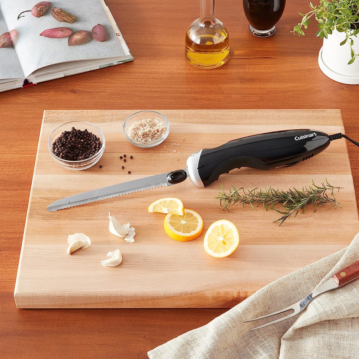 The ideal combination of performance and versatility, the Cuisinart electric knife features a powerful motor and a full-size stainless steel blade to make short work of any slicing task. Serrated for superior cutting action and dishwasher safe, the blade slices meats and bread with speed and precision. The ergonomic, nonslip handle and one-touch on/off control make this knife especially easy to operate. Equipped with a 5-foot cord to carve right at the table! Features: Powerful and easy to use|One-touch on/off operation|Ergonomic handle comfortable for right- and left-handers|Stainless steel blade cuts through meats breads vegetables and more|Blade is removable and dishwasher safe|Limited 18-month warranty