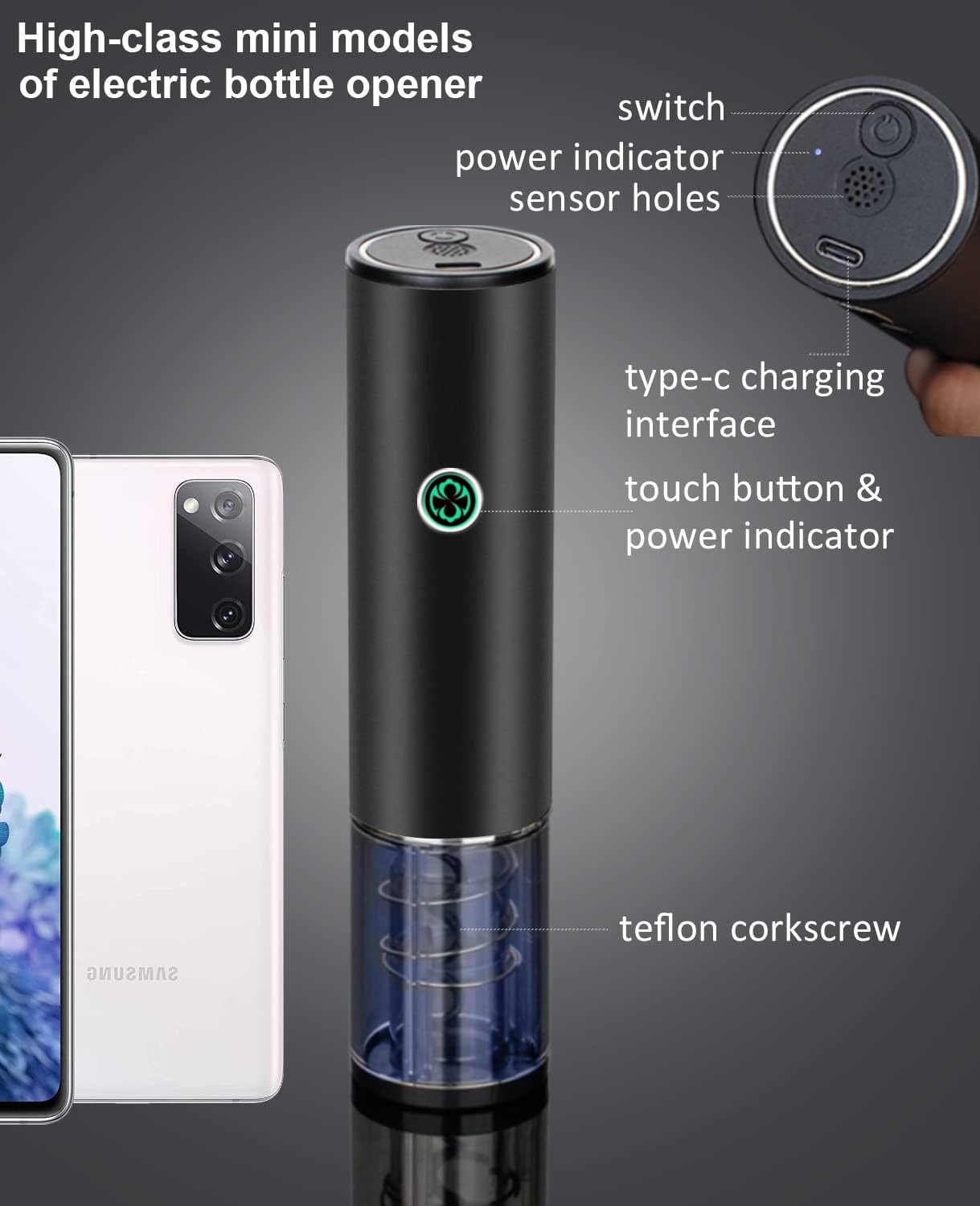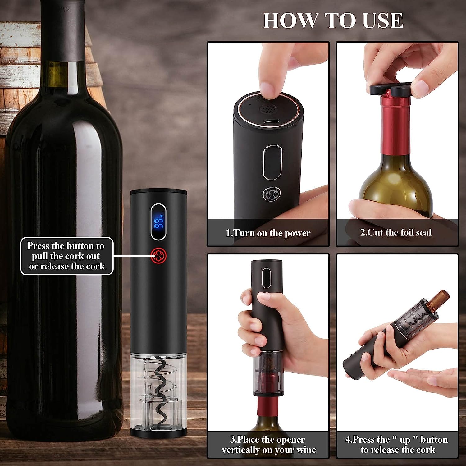 • ? ONE CLICK QUICK CORK EXTRACTION - The battery-operated rechargeable electric wine opener opens any traditional wine bottle with minimum effort. Noiseless and fast, it can safely remove corks in just about 5 seconds. Open up to 80-100 bottles on a single charge.