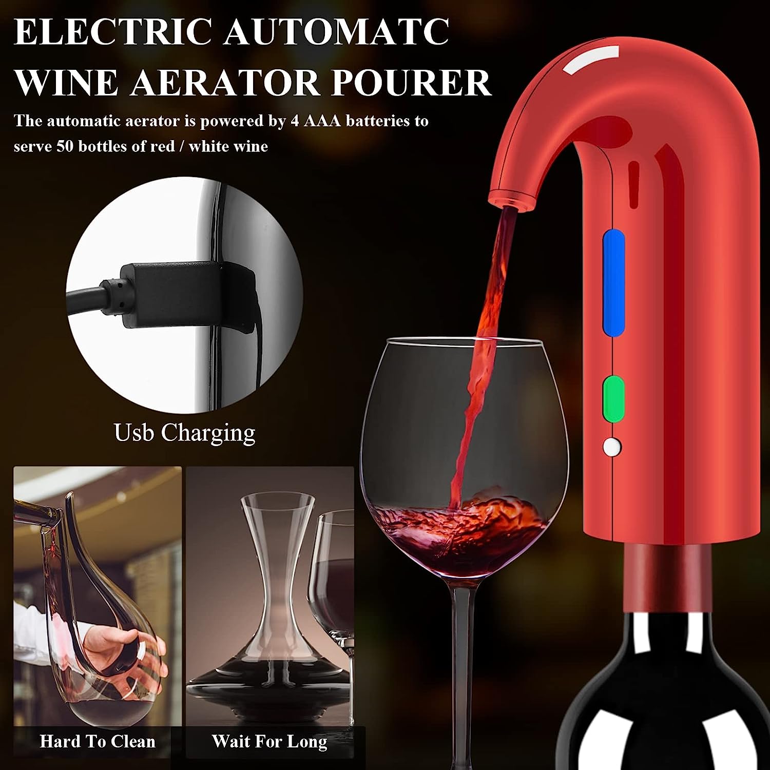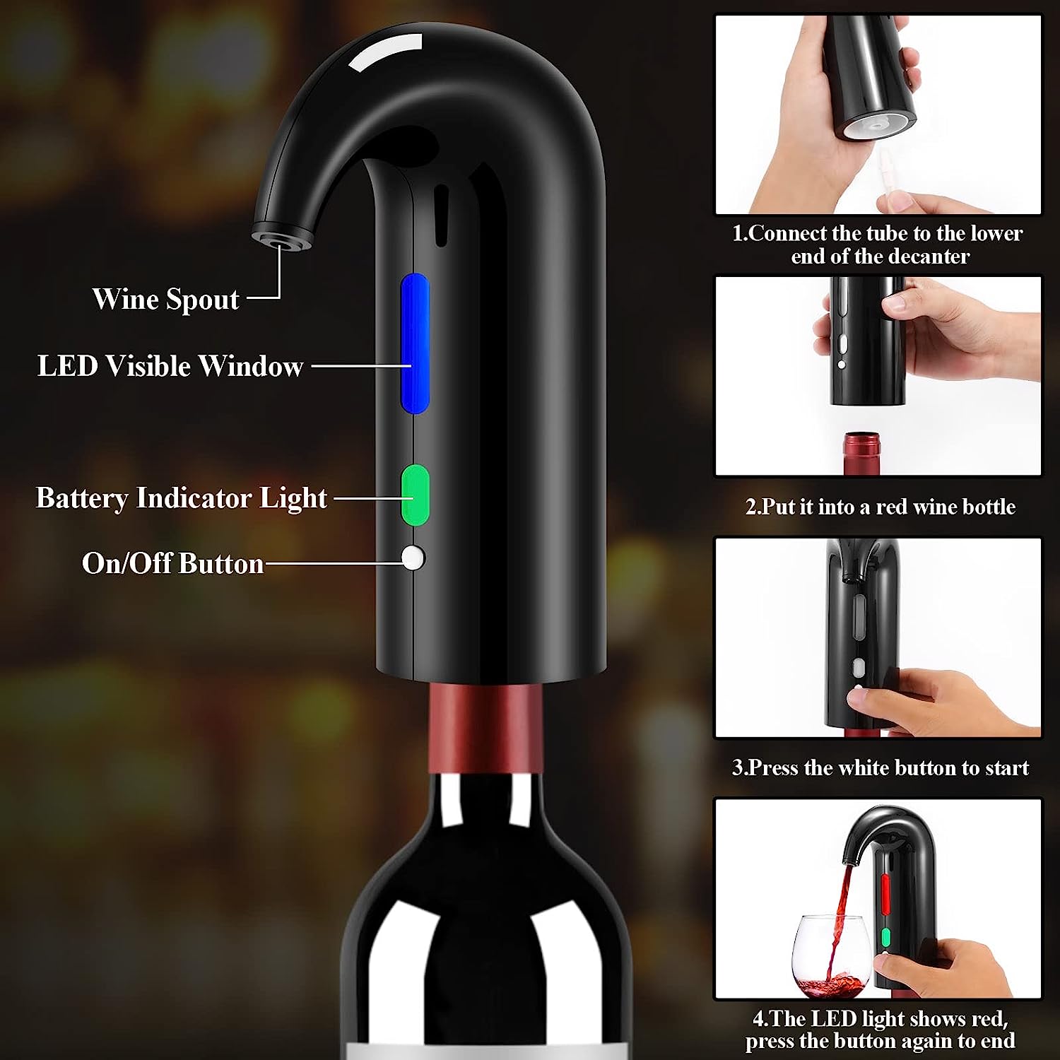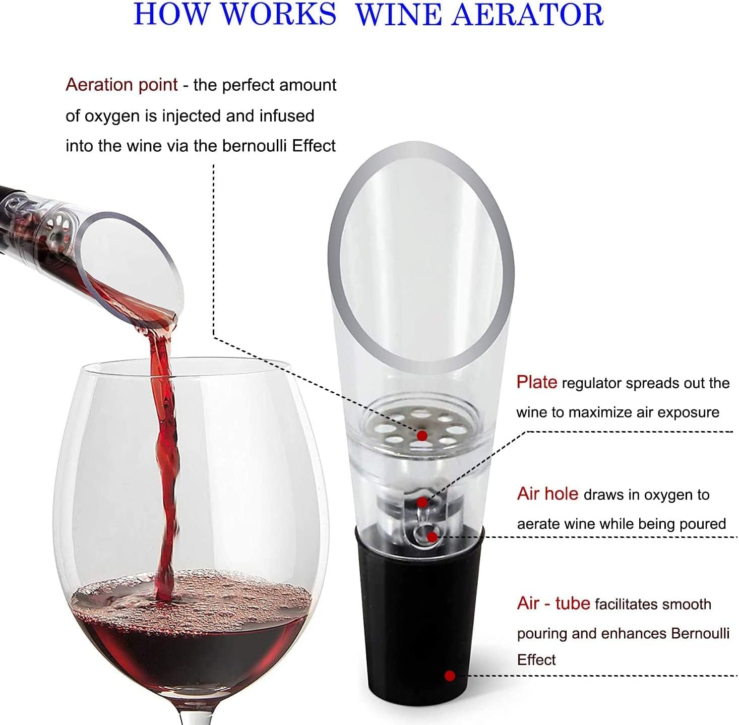 • ? ENJOY ELEVATED FLAVORS - Indulge in premium wine goodness with every sip. With the included 2-in-1 aerator and pourer, you can effectively infuse oxygen and achieve a more enhanced flavor profile while pouring, and can prevent dripping and control the flow. Vacuum Stoppers can eliminate wasted wine and preserve the flavor, keeping the wine fresh!