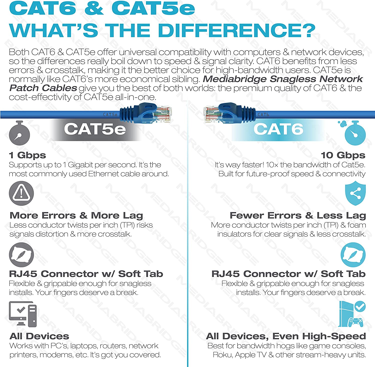 Mediabridge Ethernet Patch Cable Cat6 / Cat5eMediabridge Snagless Network Patch Cables can be used for any Cat5e or Cat6 Ethernet application and are intended for wired home and office networks. They offer universal connectivity to computers and network components, such as routers, switch boxes, network printers, network attached storage (NAS) devices, VoIP phones, and PoE devices. Built for Future-Proof Speed and Reliable ConnectivityThis cable provides exceptional transmission performance and low signal losses. It supports up to 550 MHz and is suitable for Fast Ethernet, Gigabit Ethernet, and 10-Gigabit Ethernet. Specifications- Cable Type: CAT6 4-Pair UTP (Backwards compatible with CAT5e & CAT5)- Outside Diameter: 5.8 ± 0.3 mm (0.23 ± 0.01 inch)- Connector Type: RJ45- Contact Plating: Gold Plated- Conductor Gauge: 24 AWG- Cable Performance: Up to 550 MHz- Cable Structure: Stranded- UL Listed, TIA/EIA 568-B.2 Verified- Power over Ethernet (PoE) and Voice over IP (VoIP) CompliantCompatibility- Devices with RJ45 jacks, including computers & peripherals like routers, switch boxes, network printers & network attached storage devices - Cat6 is a computer networking standard & works with Cat5e (100/1000 Base-T networks) and Cat6 (Up to 10G Base-T networks)Notes- Network speed is determined by factors other than just cables, like a router/switch box. The speed of the network can only be as fast as the slowest component. Snagless design protects clips when plugging and unplugging the cable and when running cable during installations.