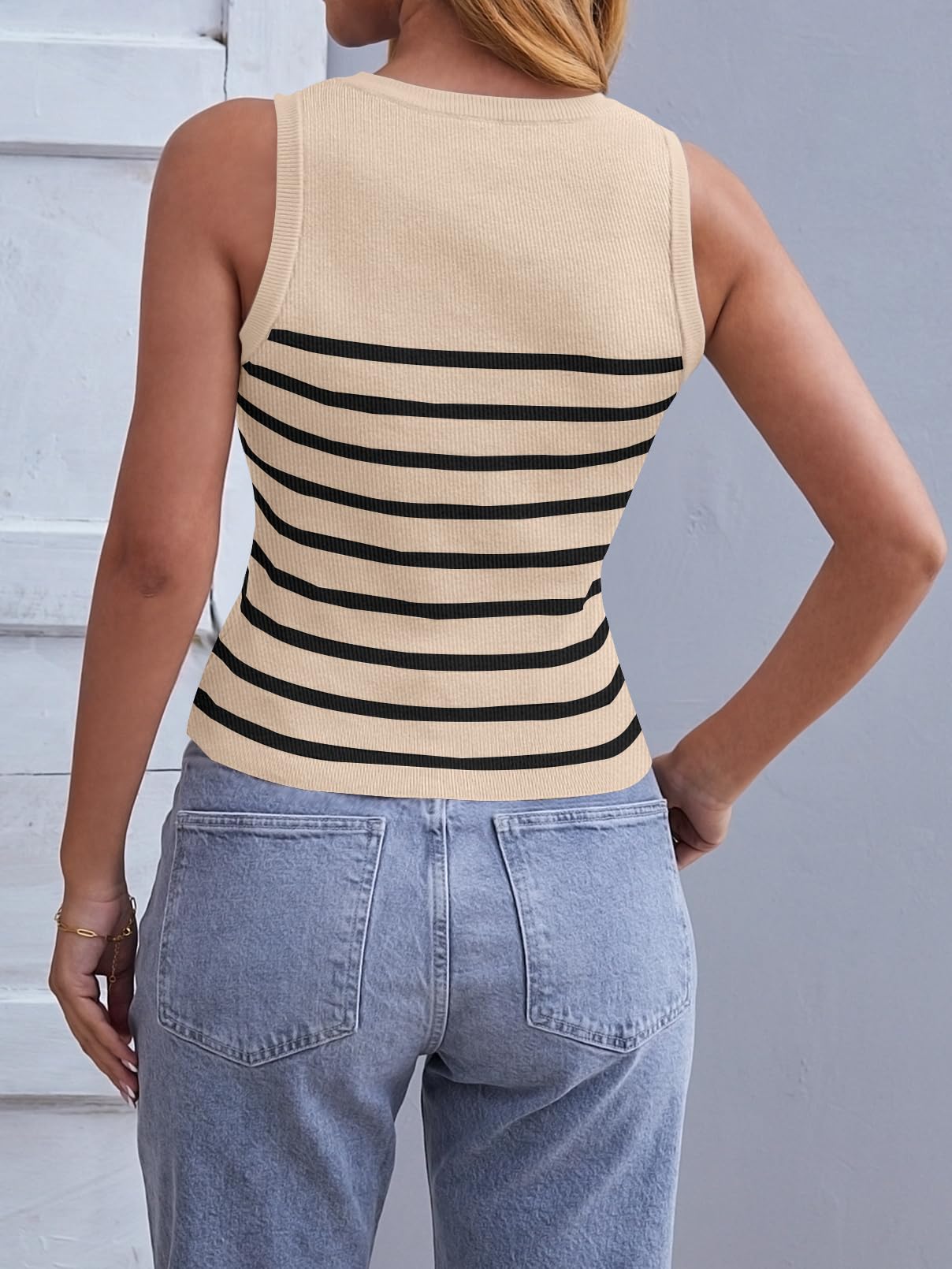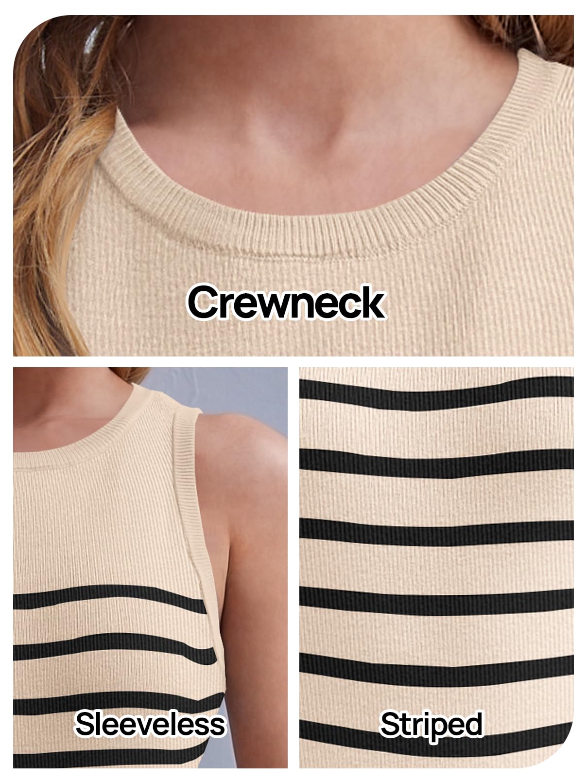 Details: Fit: Casual Slim Fit Style Features: Crewneck, sleeveless, striped, slim fit, racerback, trendy and sexy, perfect for women and teen girls.