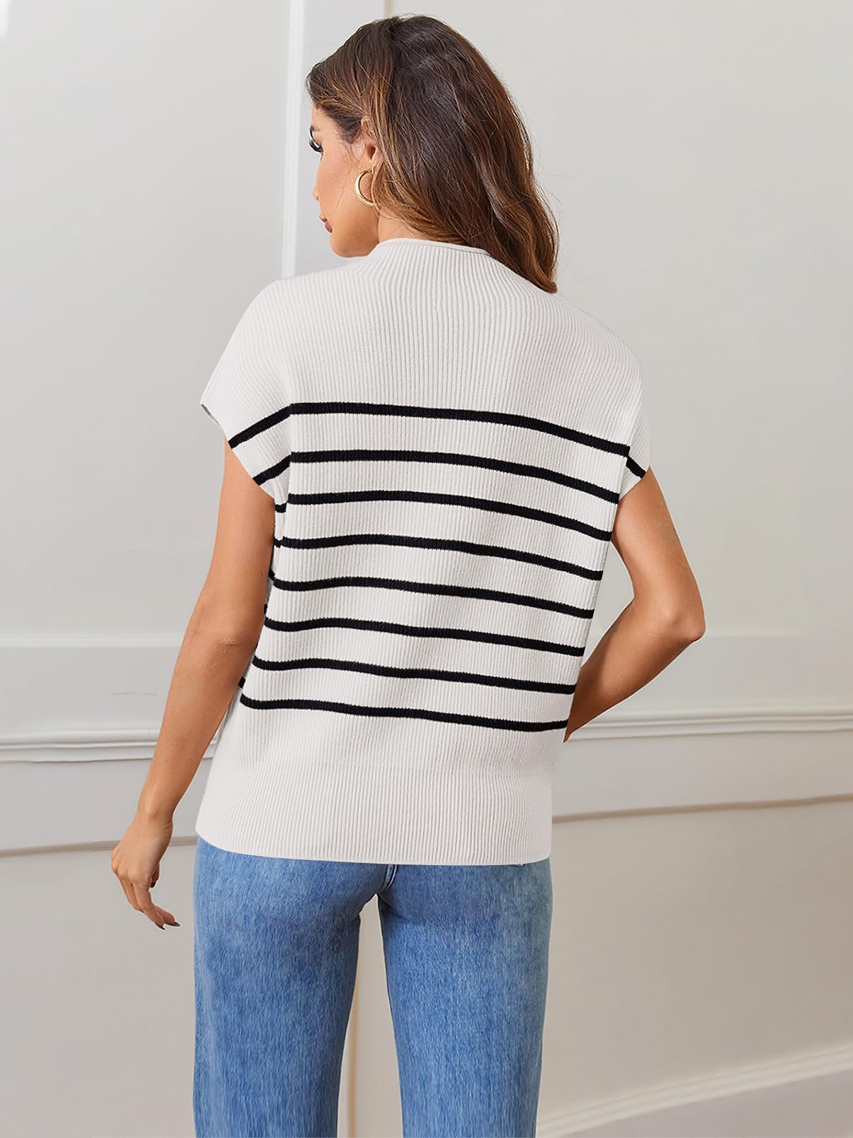 Details: Our casual sweater vest, is the perfect addition to your wardrobe! Designed with a stylish mock neck and cap sleeves, this vest exudes both elegance and trendiness. Its striped pattern adds a touch of sophistication, while the ribbed knit texture enhances its visual appeal. Crafted from a soft and cozy knitwear fabric, this vest ensures optimum comfort, keeping you warm during the colder months. Its casual loose fit offers a relaxed and comfortable feel, making it ideal for various occasions such as daily wear, office, school, work, leisure time, streetwear, nights out, shopping, dates, and holidays. The French style influence adds a chic and fashionable flair, making this vest a versatile piece that can be effortlessly dressed up or down. Its relaxed fit complements any body type, allowing you to feel confident and stylish no matter the occasion. Our pullover vest is made with a casual loose fit, ensuring a relaxed and comfortable experience throughout the day. The knitwear construction provides a soft and warm feel, perfect for those chilly days. The skin-friendly fabric guarantees maximum comfort, allowing you to wear it for extended periods without any discomfort. Not only is this vest comfortable and trendy, but it is also crafted with skin-friendly materials, ensuring a gentle touch against your skin. Crafted with a French style in mind, this elegant and cute vest combines fashion and comfort seamlessly. Featuring a stylish mock neck and cap sleeves, this vest brings a touch of sophistication to your daily wear. The striped design adds a playful twist, while the ribbed knit texture enhances its trendy appeal. Upgrade your wardrobe with our Casual Sweater Vest and experience the perfect blend of style and comfort. Add a touch of sophistication and elegance to your outfit while staying cozy and warm. Try now and let this versatile vest become your go-to piece for any occasion!