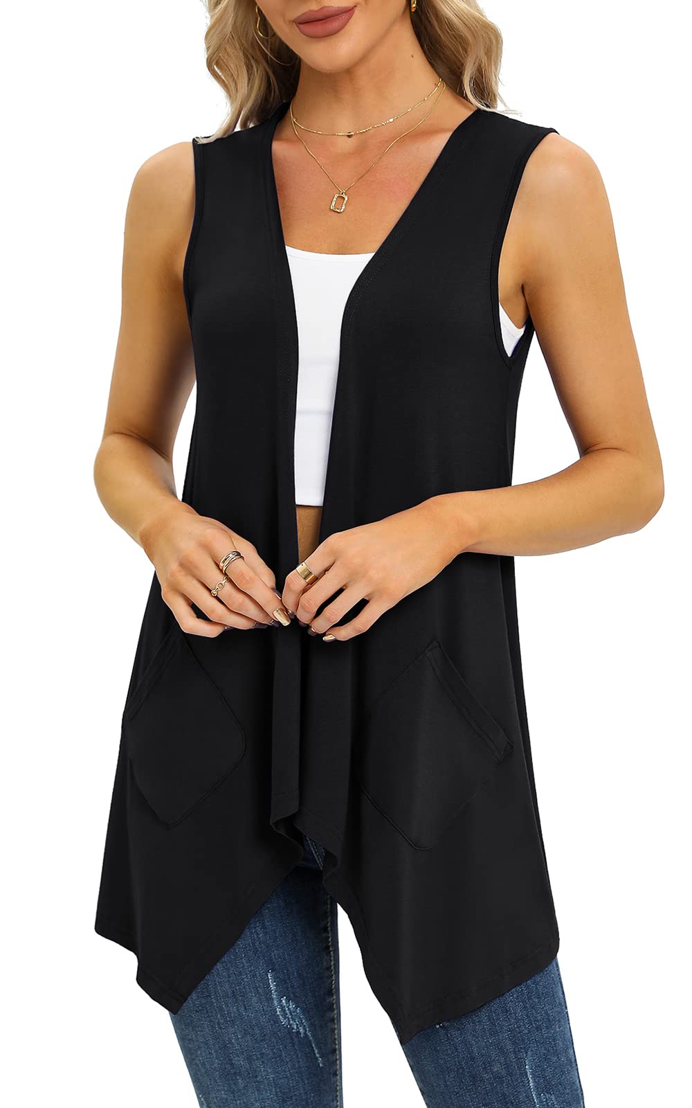 • Lightweight Cool and Trendy Enough: This sleeveless cardigans for women WITH POCKETS is made of very soft lightweight breathable and stretchy material feels wonderful against your skin, and comfortable fashion casual to wear. Cut a draped asymmetric hem to be very figure flattering, hangs well in elegant folds for a flowing finish, long in front and short in back, pretty nice for a fun layered look.