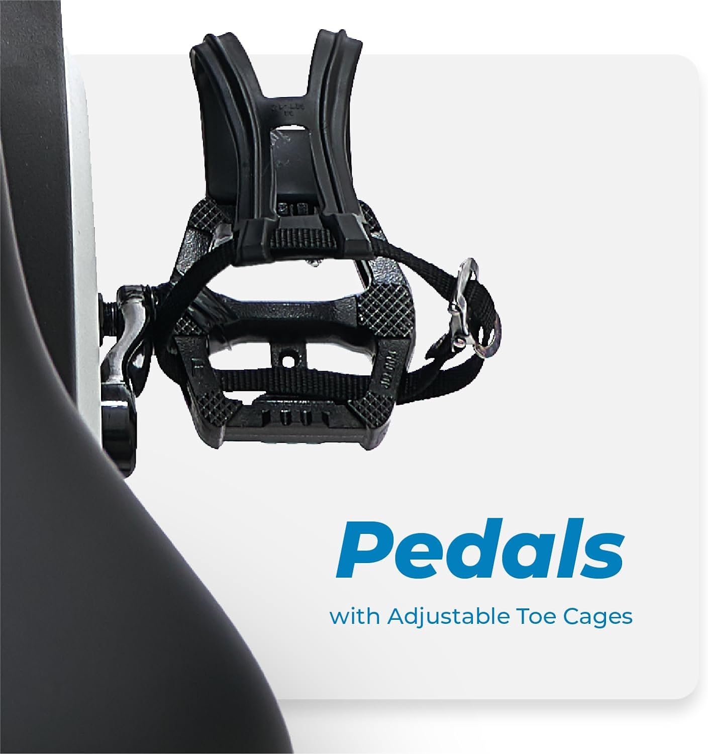 • FEATURES and PERFORMANCE: 32 levels of silent precise resistance lets you vary your workout intensity - Fully adjustable toe cages on the pedals for a secure fit - Extra-large cushioned seat offers comfortable riding - Powder-coat frame for resistance to scratches - Padded handlebars are slip-resistant.