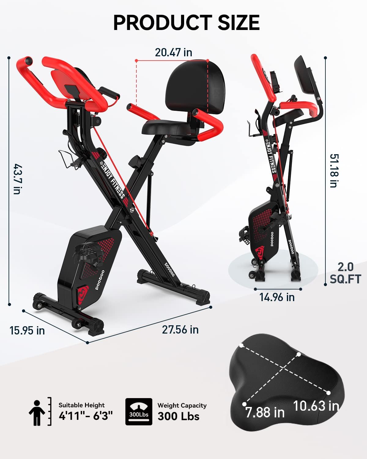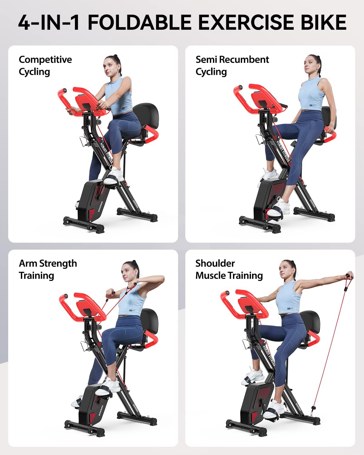 • 【4-IN-1 Folding Exercise Bike for Home Workout】The upright posture of this bike provides you with high-intensity exercise, helping you burn more calories. The semi-recumbent posture offers a low-impact and more comfortable riding experience. Additionally, this bike comes with arm resistance bands to help tone your upper muscles and provide a complete body workout.