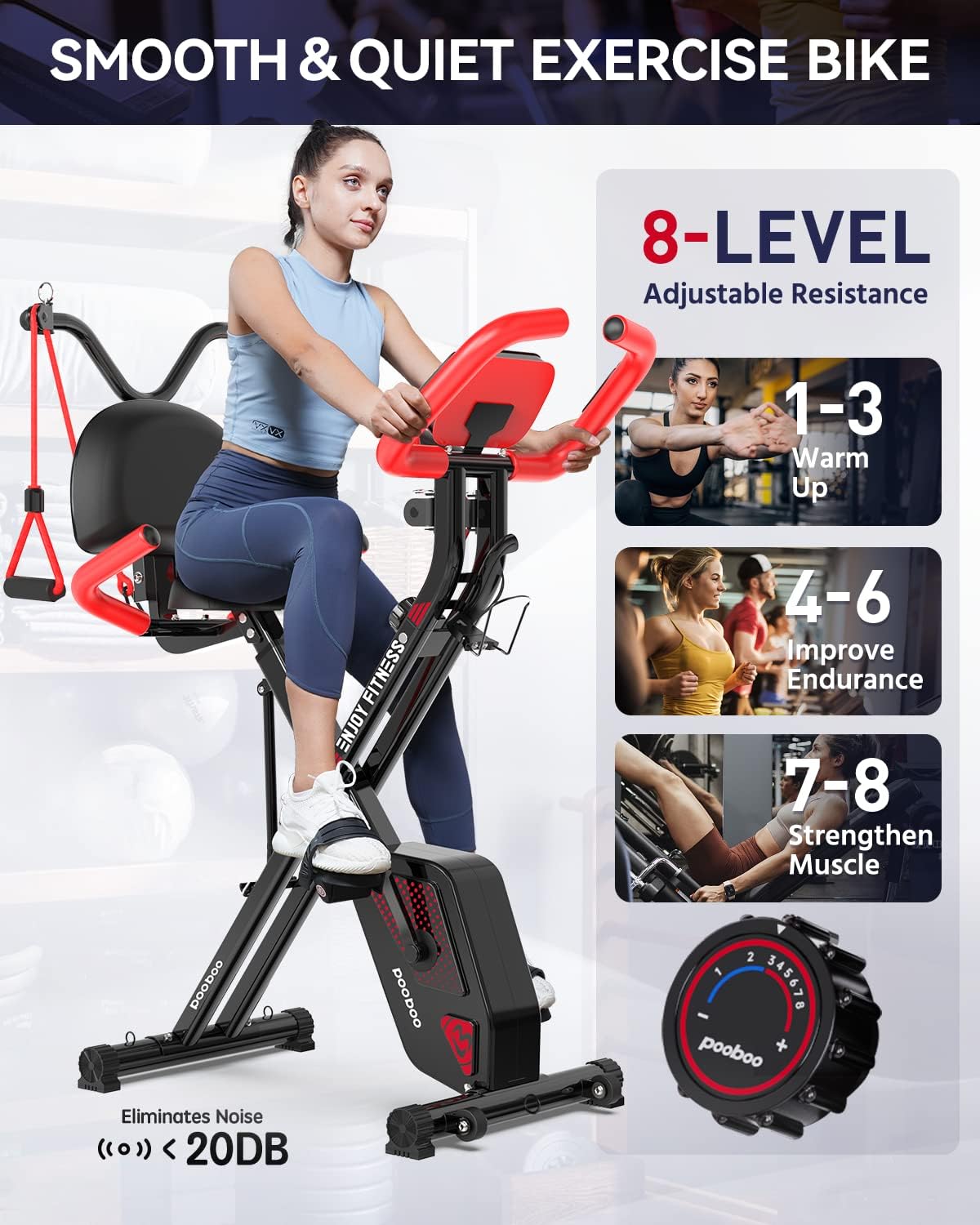 pooboo Folding Exercise Bike, Foldable Fitness Stationary Bike Machine, Upright Indoor Cycling Bike, Magnetic X-Bike with 8-Level Adjustable Resistance, Bottle Holder & Back Support Cushion for Home Gym Workout