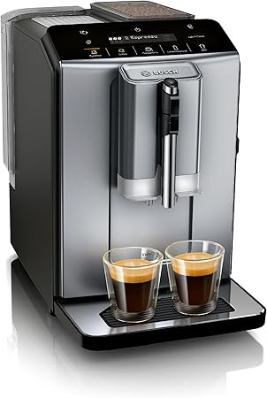 Bosch TIU20508 300 Series Fully Automatic Espresso Machine with Milk Express (in-cup frother), LCD + Touch Control Panel, Cup Warmer, OneTouch Milk-based Beverages and 5 Beverage Options, Dark Silver