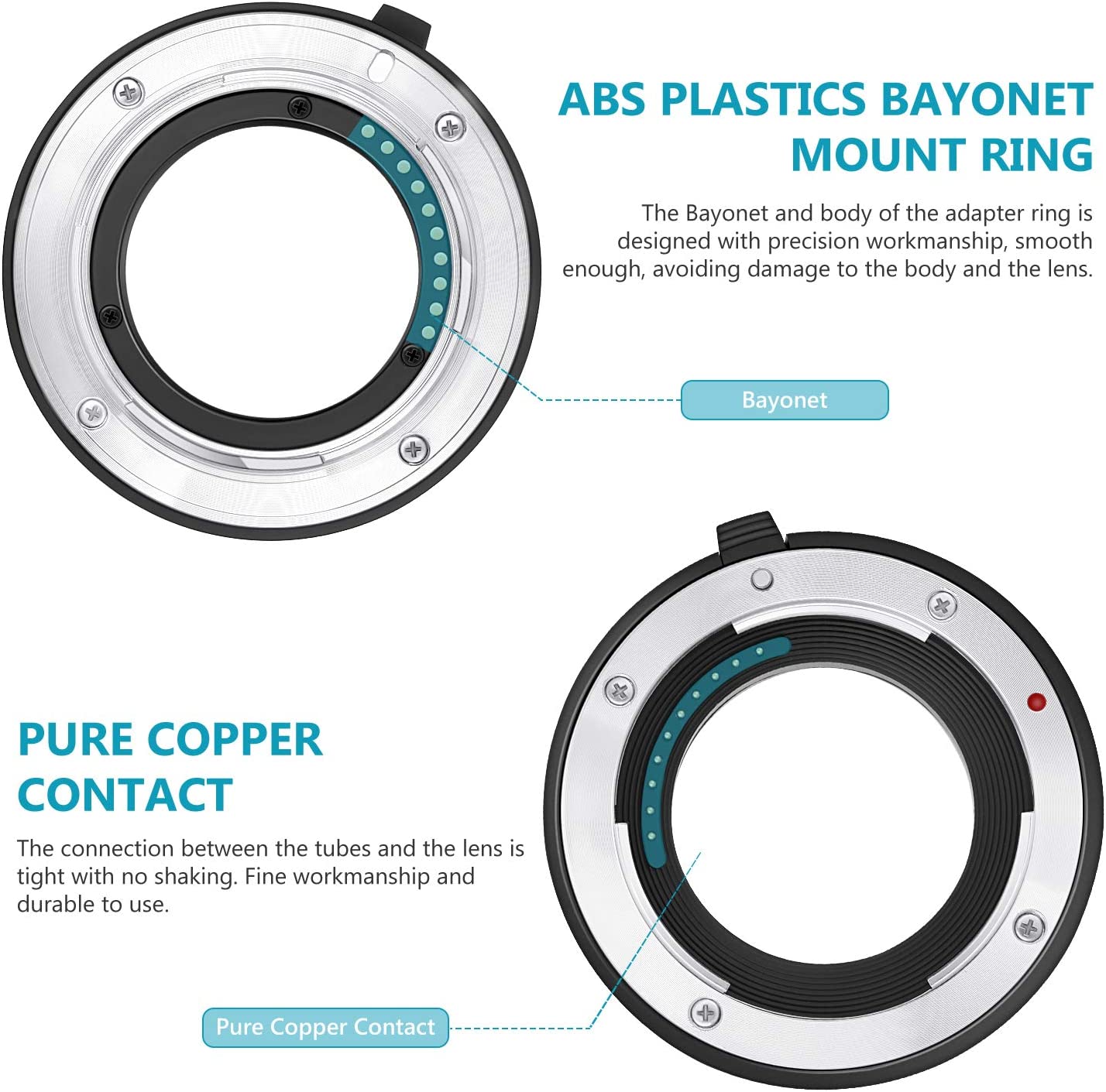 • 2 EXTENSION TUBES: 2 tubes (10mm, 16mm) can be used alone or in combination (10mm+16mm=26mm) for different degree of magnification, support AF (Auto Focus). NOTE: the focal length of lens should be greater than the length (10mm 16mm or 26mm ) of the tube