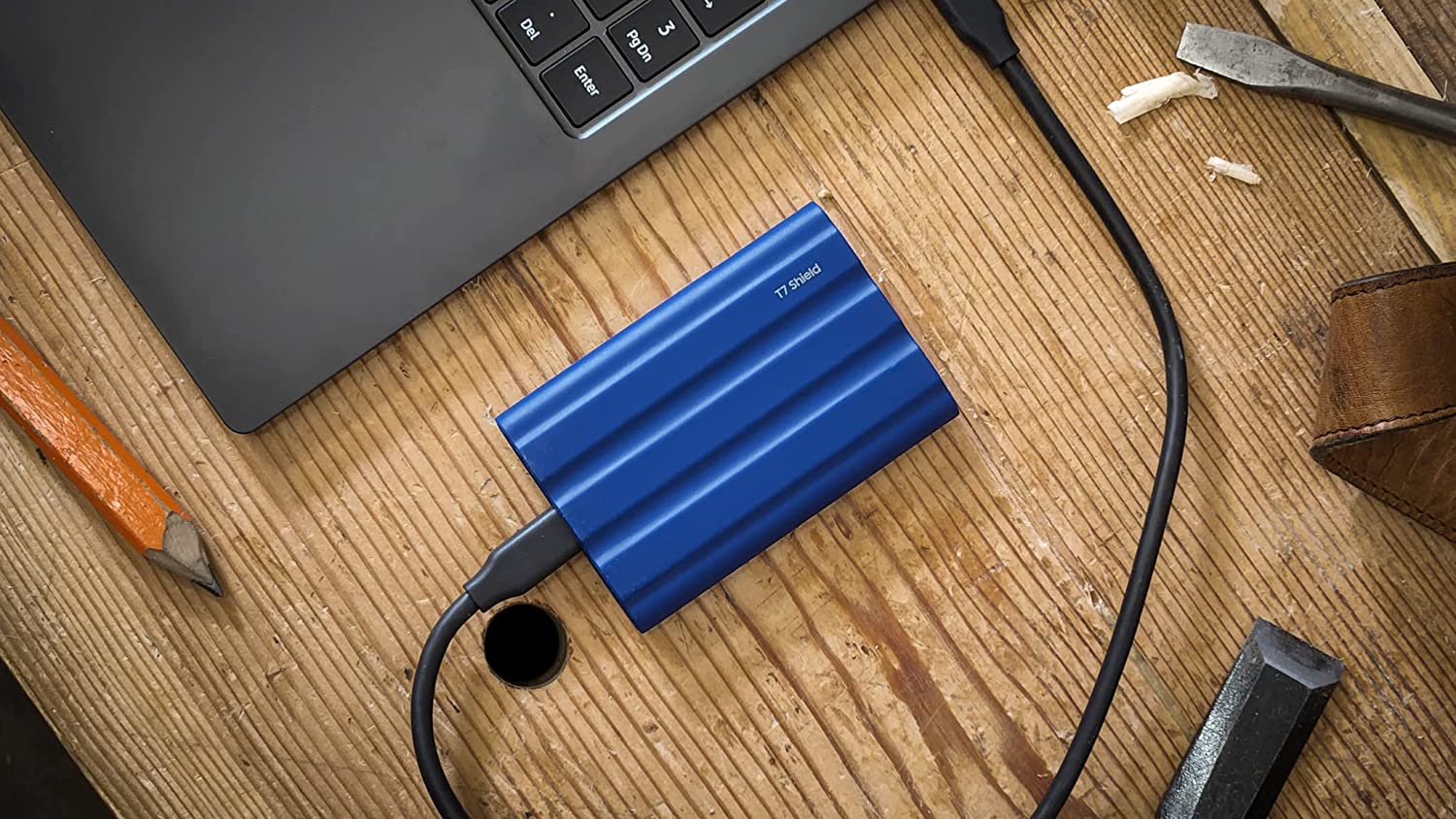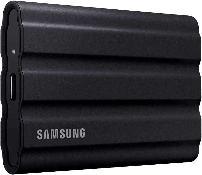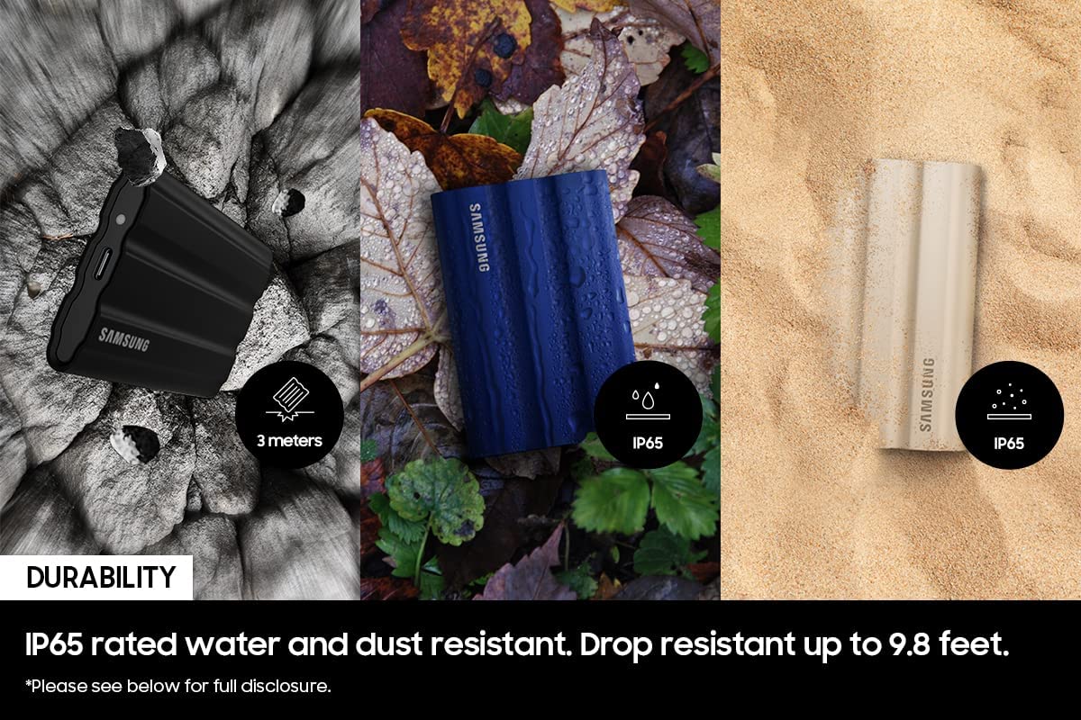 Samsung T7 Shield Portable SSD delivers high performance on-the-go, not matter the terrain. It has an IP65 rating for water** and dust* resistance, with Dynamic Thermal Guard to manage heat control. Transfer huge files instantly. USB 3.2 Gen 2 and PCIe® NVMe™ achieve soaring sequential read/write speeds of up to 1,050/1,000 MB/s***, allowing you to edit directly from the drive. The rugged design and advanced outer elastomer add extra durability to even endure a 9.8 foot drop****. The T7 Shield is compatible with PC, Mac, Android devices, gaming consoles, and more*****. Included in the box are USB Type C-to-C and Type C-to-A cables****** for added convenience. Comes with a 3 Year warranty.*Consistent with IP65 rating, tested under controlled conditions: 2kg/m3 of active dust with a pressure under 2kPa for 8 hours. Dust resistant capabilities may vary depending on the actual conditions. **Consistent with IP65 rating, tested under controlled conditions: water flow of 100kPa for 3 minutes. Water resistant capabilities may vary depending on the actual conditions. ***Performance may vary depending on host configuration. To reach maximum read/write speeds of up to 1,050/1,000 MB/s, respectively, the host device and connection cables must support USB 3.2 Gen 2 and the UASP mode must be enabled. Test system configuration: ASUS Z270 ROG MAXIMUS IX HERO (USB 3.2 Gen2 Type-C), Intel(R) Core(TM) i7-7700K CPU @ 4.20GHz, OS- Windows 10 19H2. ****Tested to withstand 9.8-ft (3 meters) drop under controlled conditions. Drop resistance capability may vary depending on the actual environmental conditions. *****Compatibility with host devices may vary. Some operating systems may require T7 Shield reformatting. ******T7 Shield is compatible with USB 3.0 and USB 2.0. *******Source: 2003~2021 OMDIA data: NAND suppliers' revenue market share.