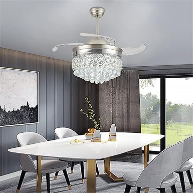 YIYIBYUS 42 Inch Crystal Ceiling Fan with Lights and Remote Control Modern Luxury Invisible Retractable Blade Chandelier Three-Color Change LED Ceiling Fan Light Kit