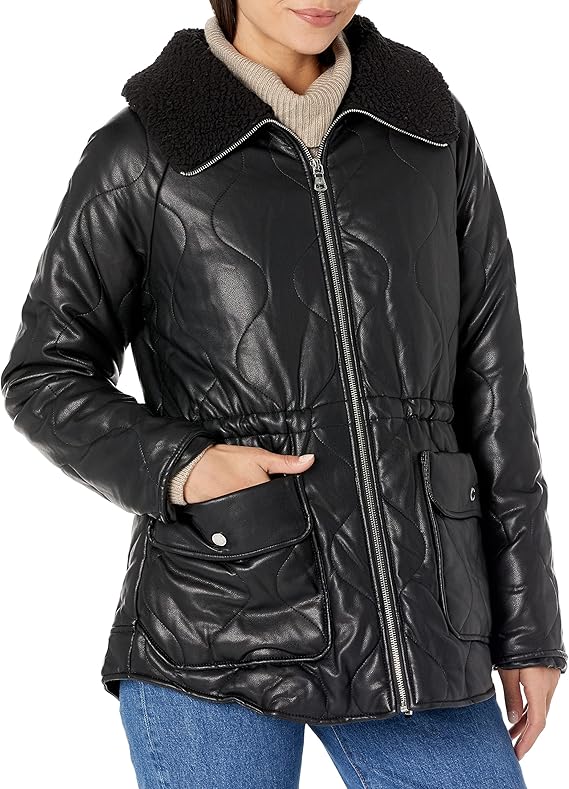 KENNETH COLE Women's Faux leather Sherpa Lined Collar Jacket, CINCH WAIST BLACK, Large