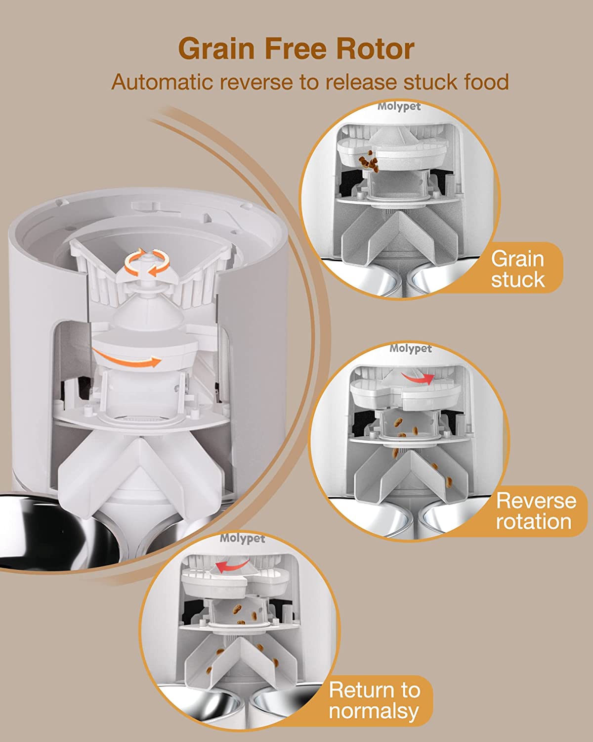 • 【Intelligent Grain Output】 If grain is stuck in the feeder, the motor will immediately reverse, release the stuck grain and then return to the original direction. If the device detects that the food outlet is blocked, the feeder will stop feeding. No missed feeds due to jamming and no wasted food due to blockages.
