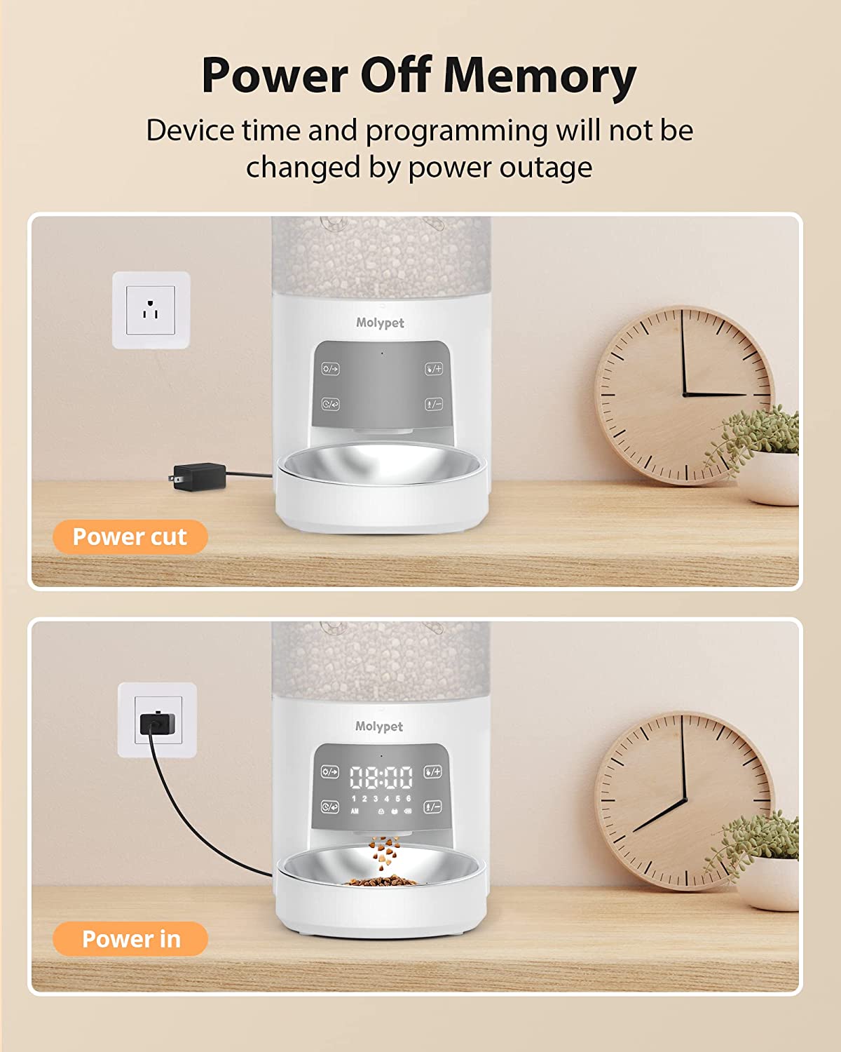 • 【Power Off Memory】This cat feeder supports separately powered by plug-in or D-cell battery (battery not included). Built-in microchip, all meals settings remain unchanged after power failure and power on again within 7 days without resetting the device time.